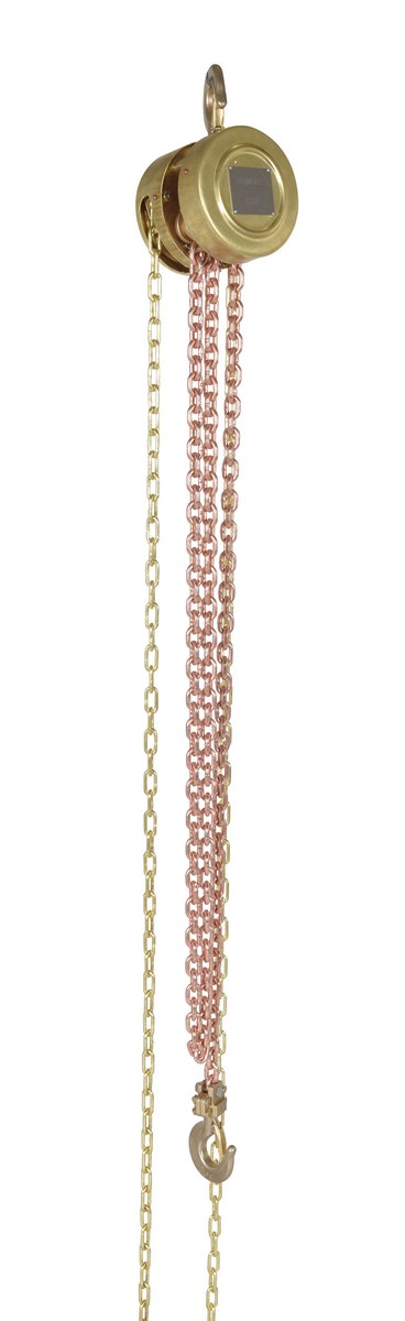 Non-Sparking brass construction. Brake engages automatically as soon as the hand chain stops moving. Forged load hooks. Low gear ratio reduced effort required for lifting. Satisfies relevant ANSI B 30.16-2003 requirements.