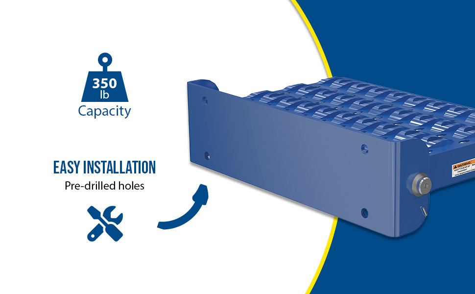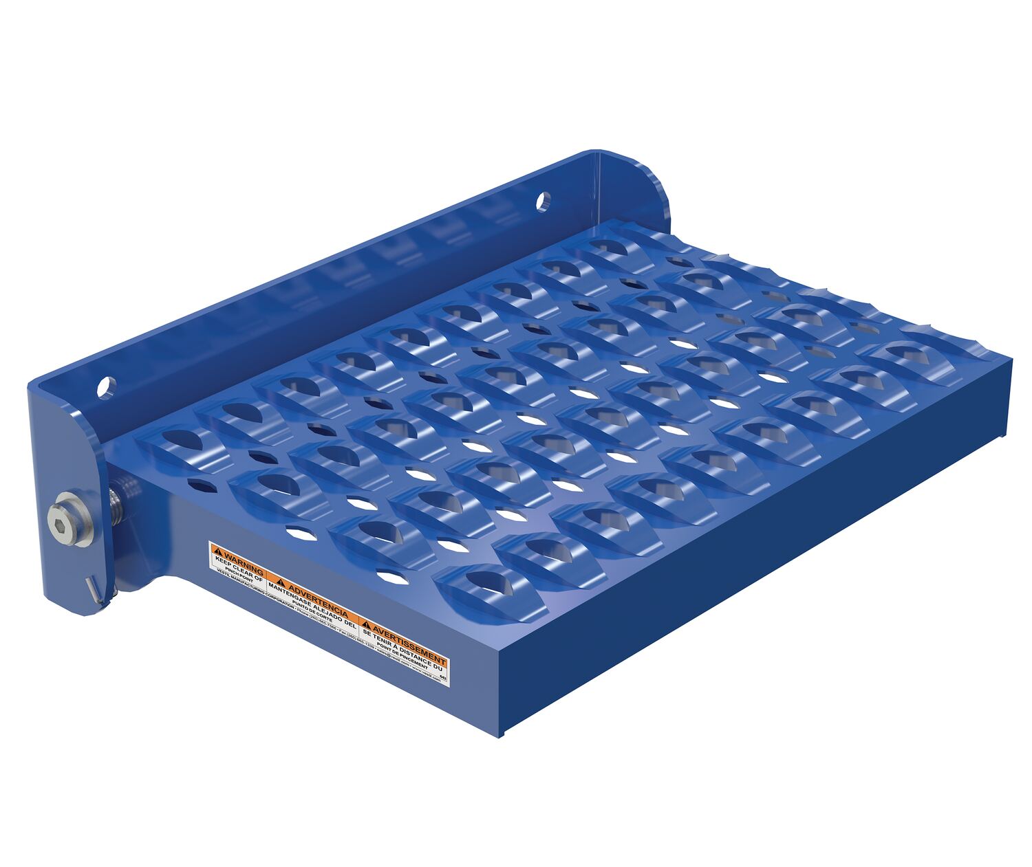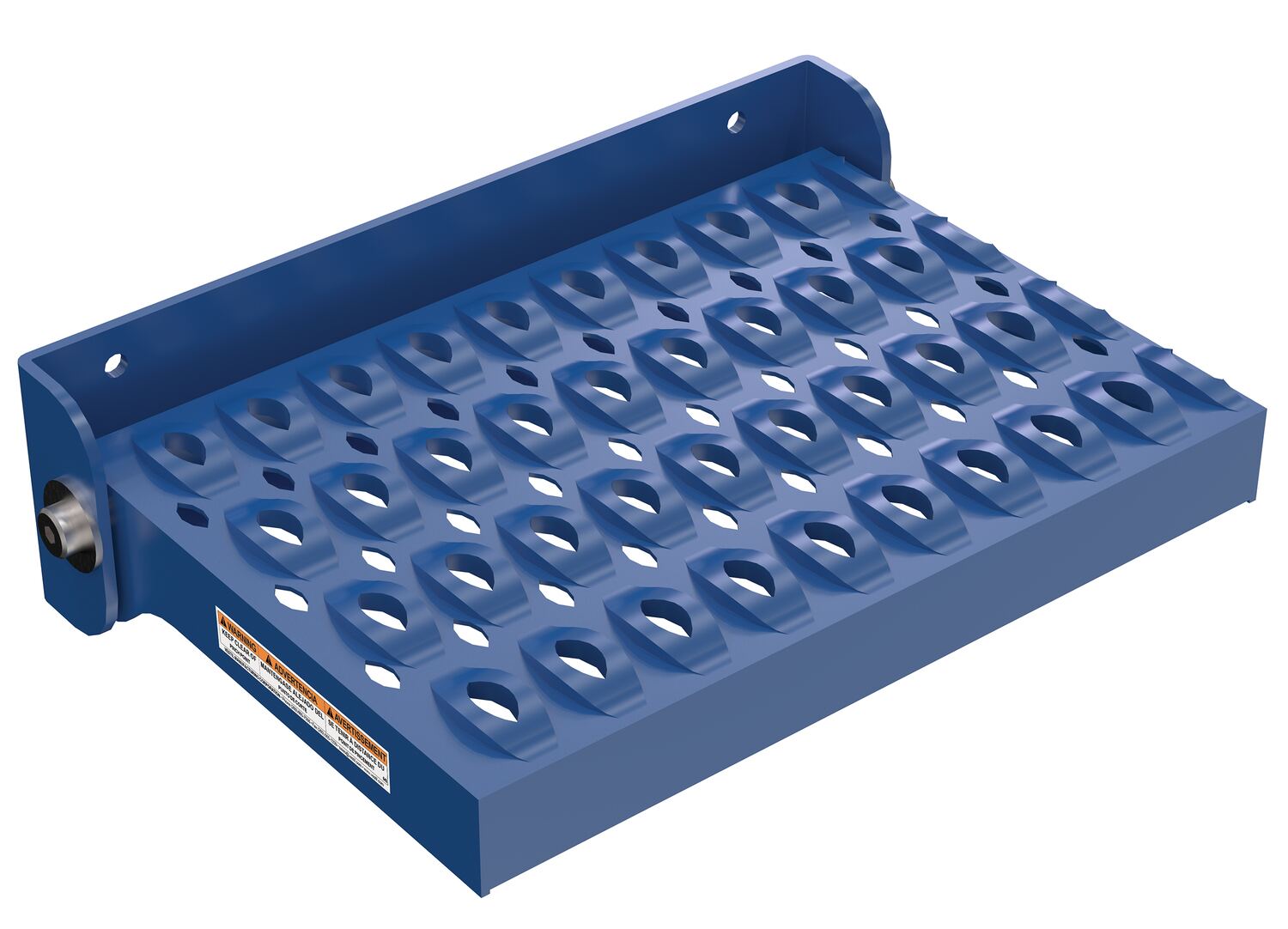 Easily rotate step to vertical position when not in use. Step is steel with powder coat blue finish and has a serrated surface for traction. Two 7/16" diameter mounting holes included. Fasteners are not included. Available in manual or spring loaded design. Baked-in powder coat blue finish for added toughness.