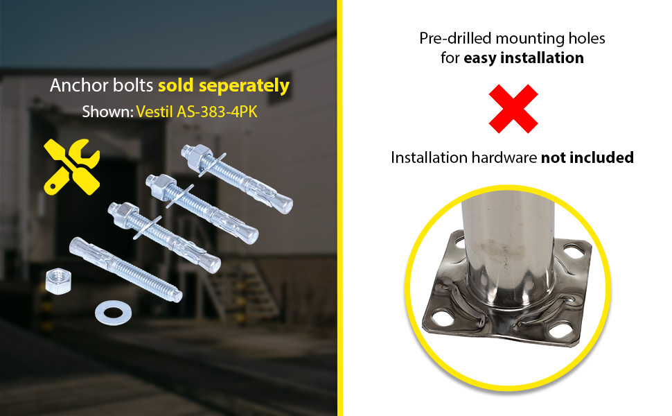 Bollards can be used both indoors and outdoors to protect work areas, racking and personnel. Steel caps are welded on. Base plate measures 8" x 8" and includes four (4) pre-drilled mounting holes. Mounting kits available. 304 stainless steel polished finish.