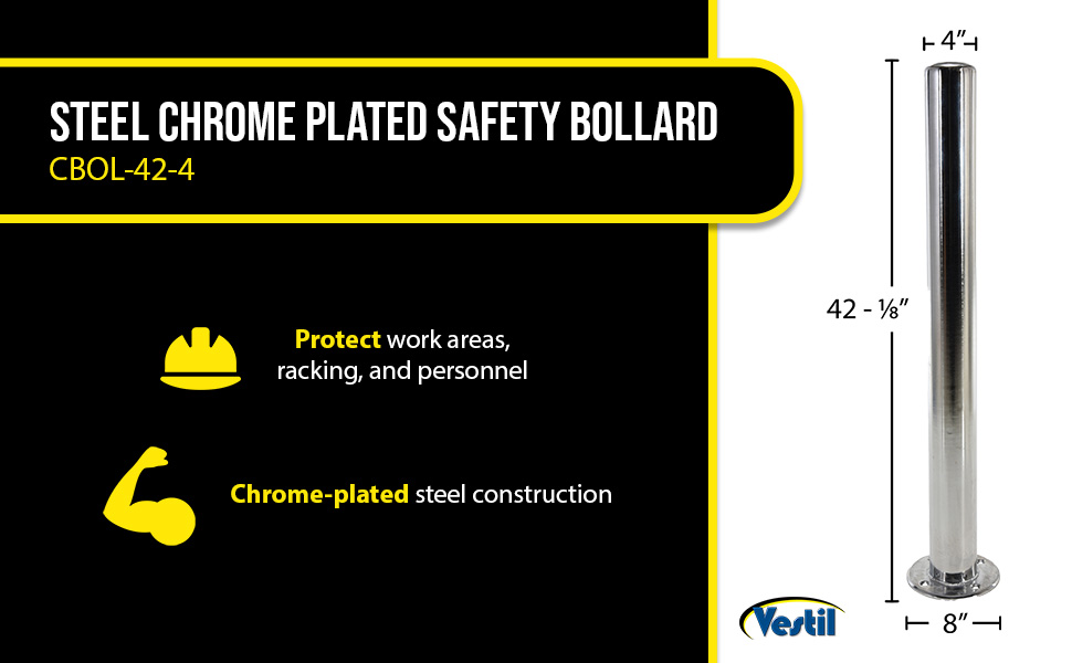 Improve the image of your facility while protecting people and equipment with this heavy-duty Chrome Bollard. Unit is made of steel and finished with an attractive bright chrome plating for a clean fresh look. Mounting hole diameter. is 1/2" x 4 holes Mounting plate outer diameter is 8" Mounting plate thickness is 3/8". Recommended for indoor use.