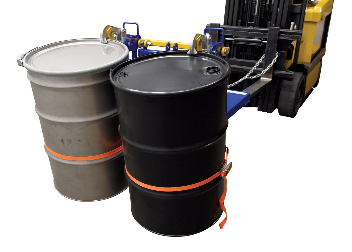 This time tested and proven design allows a fork truck operator to easily secure, move, and release drums without leaving the seat of the fork truck. For use with open (lid installed and secured) and closed head 30 and 55-gallon plastic, steel and fiber drums with a top lip strong enough to support the weight of the drum. Choose single-drum or double-drum configuration. Includes safety restraint to secure unit to the fork truck. Welded steel construction. Powder coat finish for baked in powder-coated toughness. Fork pockets measure 7-1/2" wide x 2-1/2" high usable on 20-1/2" centers. A ratchet strap is supplied to secure the drum to the unit when traveling over rough terrain. Additonal or replacement ratchet straps available, contact factory. Meets OSHA 1910-178 requirements.
