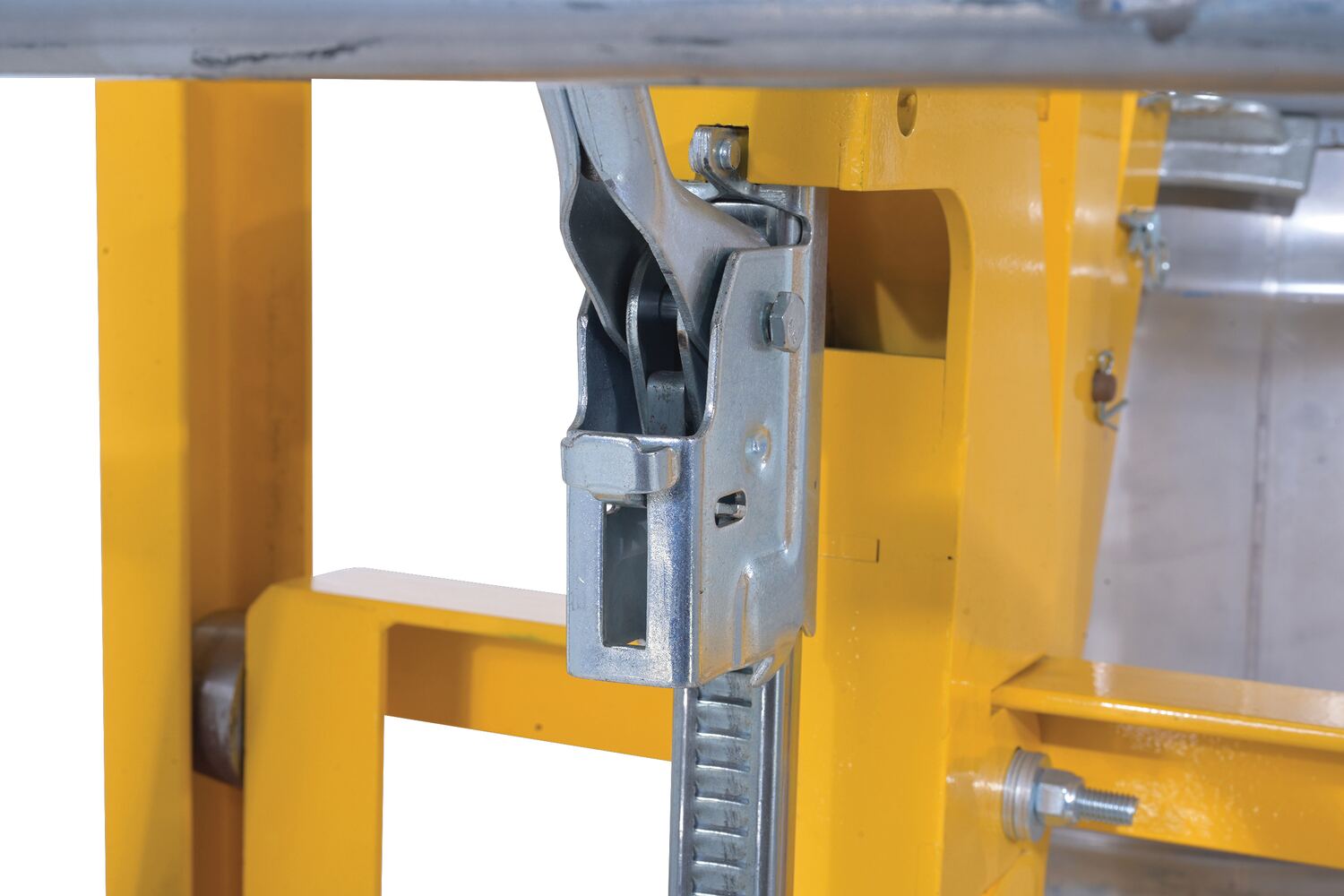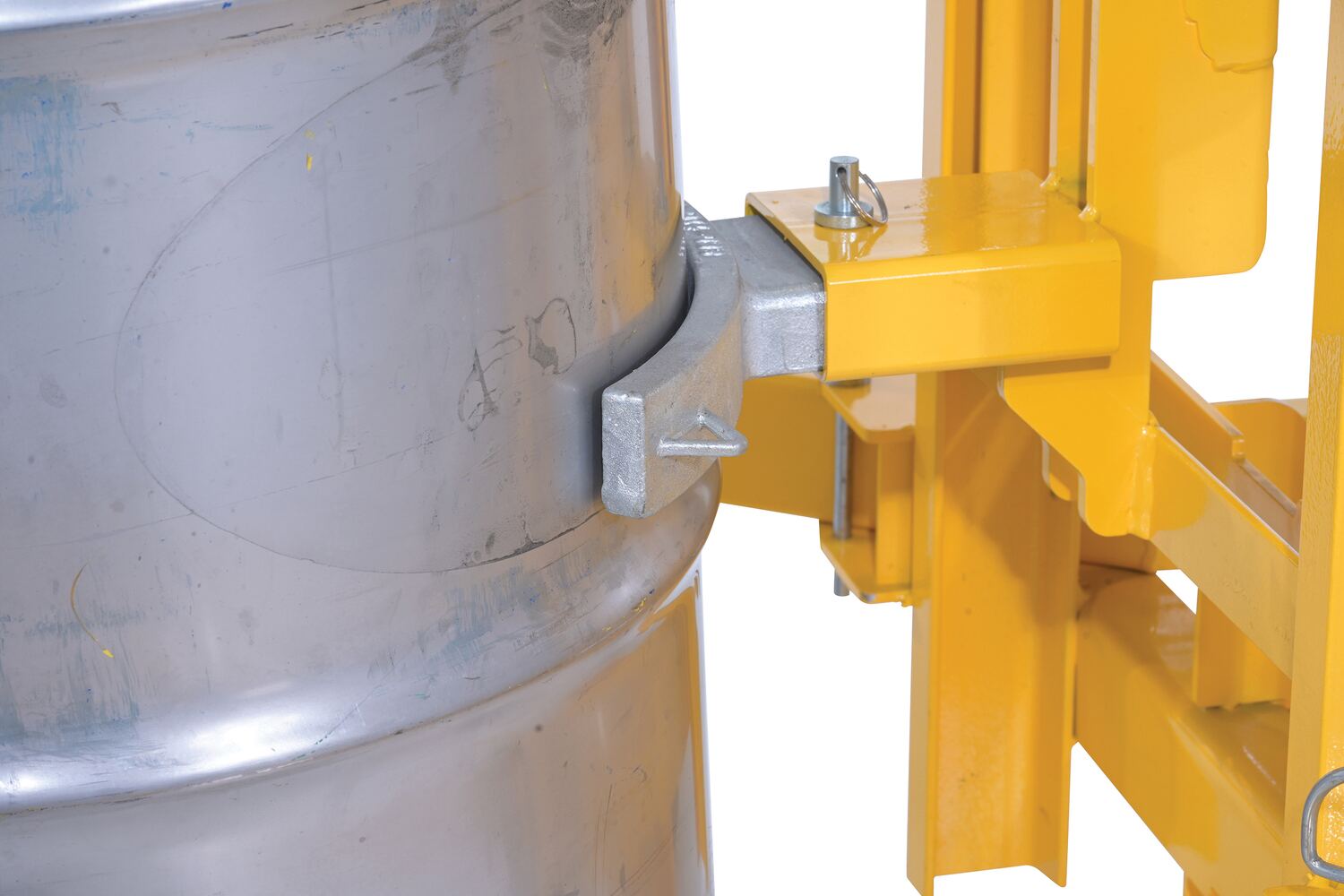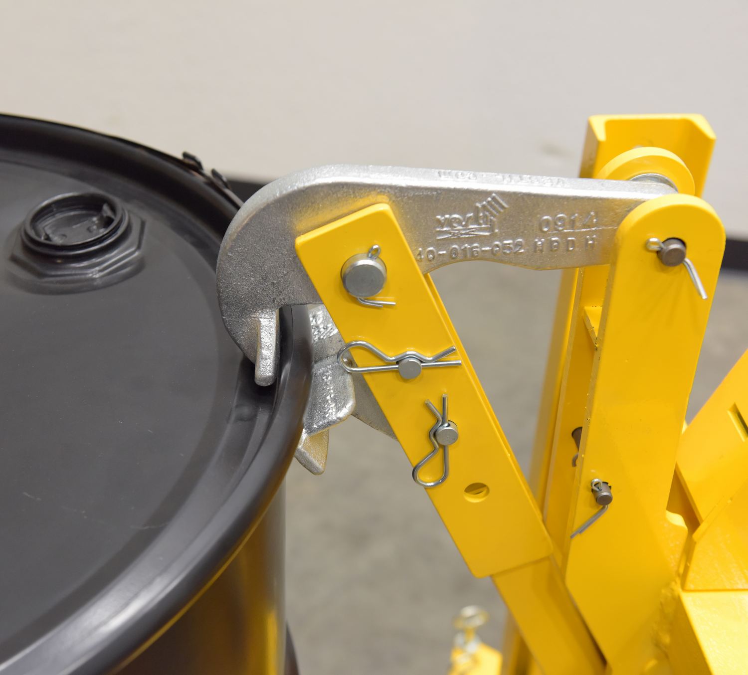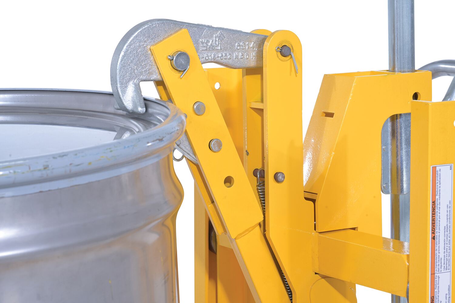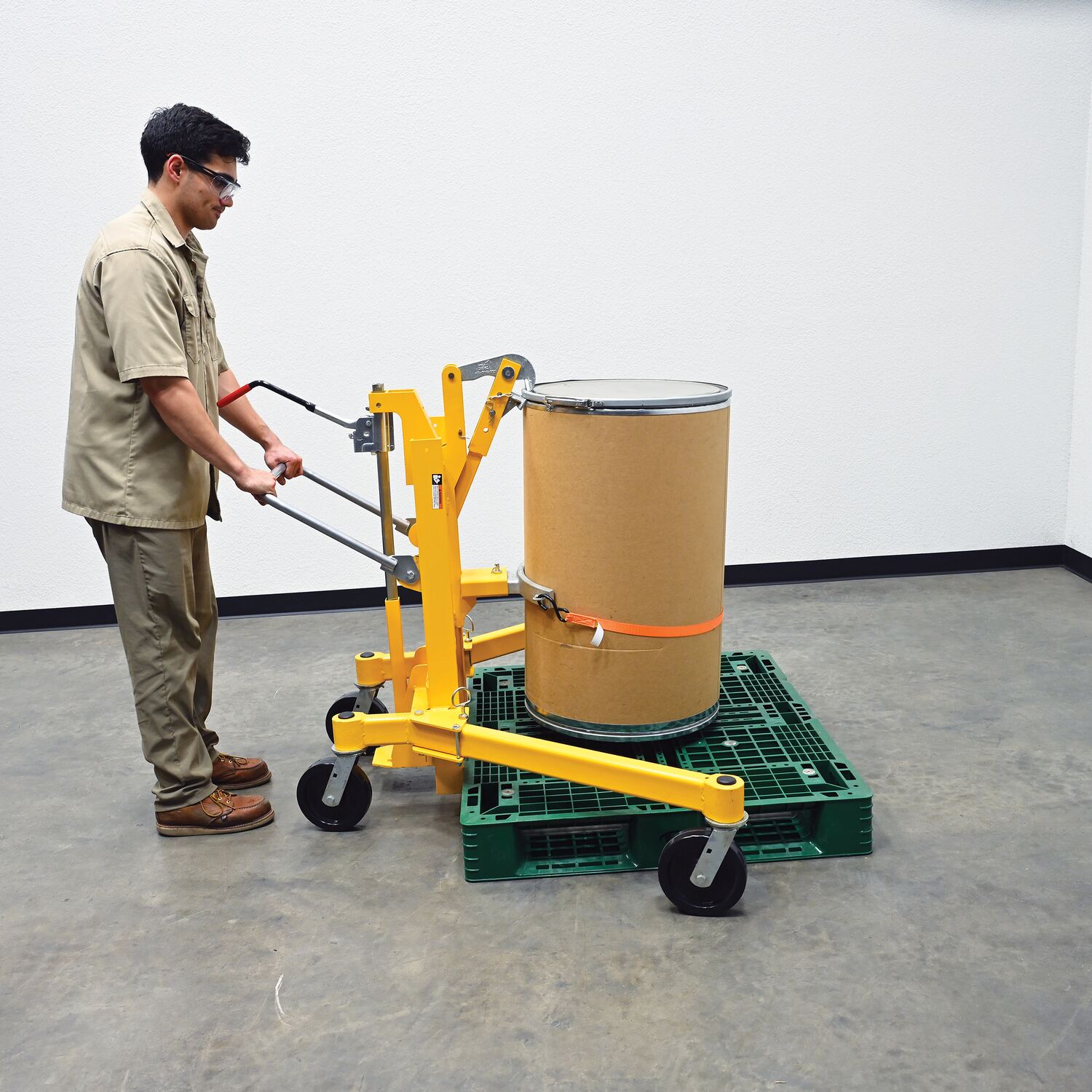 Unique portable unit designed to lift and transport steel, plastic, and fiber drums with a top lip. Steel jaw securely grips the top lip of the drum. Available with either a manual mechanical ratchet, foot pump hydraulic, or DC powered lift mechanism. Straddle legs rotate for access to drums on pallets. Units roll on four (4) 8" x 2" phenolic swivel casters. The push handle folds down for easy access to ratchet and foot pump. All welded steel construction. Baked-in powder coated toughness with a safety yellow finish. Optional scale weighs drums to an accuracy of +/-0.5 pounds. Optional scale includes (6) AA cell batteries and an AC adaptor.