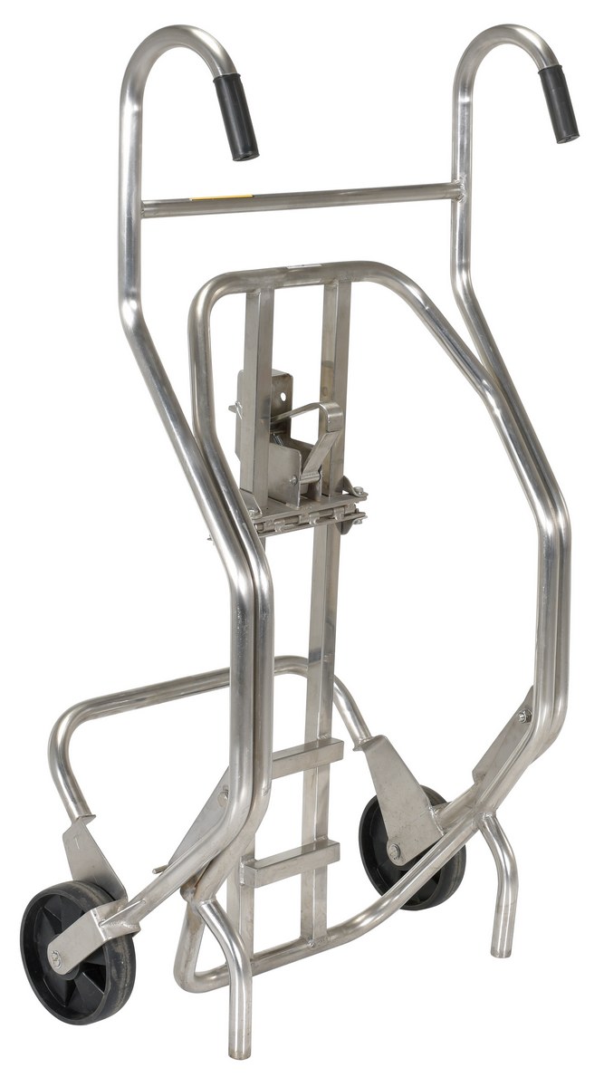 model DBT-SS, Tilt and lower drums to a horizontal position for dispensing. Grips all types of steel 30, 55, & 85 gallon drums and most rimmed plastic and fiber drums. Robust, noncorrosive design - 304 all stainless steel construction. Adjustable chime hook helps to secure the drum. Kickstand for holding the unit in stand-up position. 4-wheel design offers exceptional maneuverability through tight areas. 4-1/2" ground clearance with four (4) 8" x 2" nylon wheels.