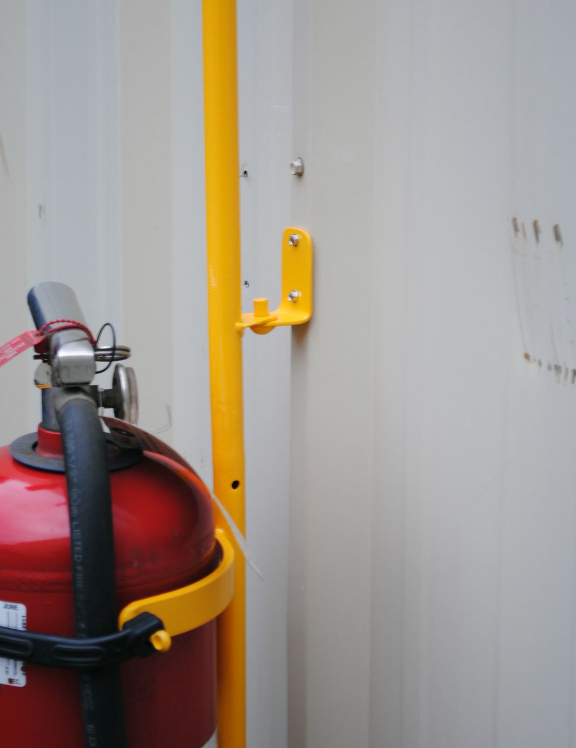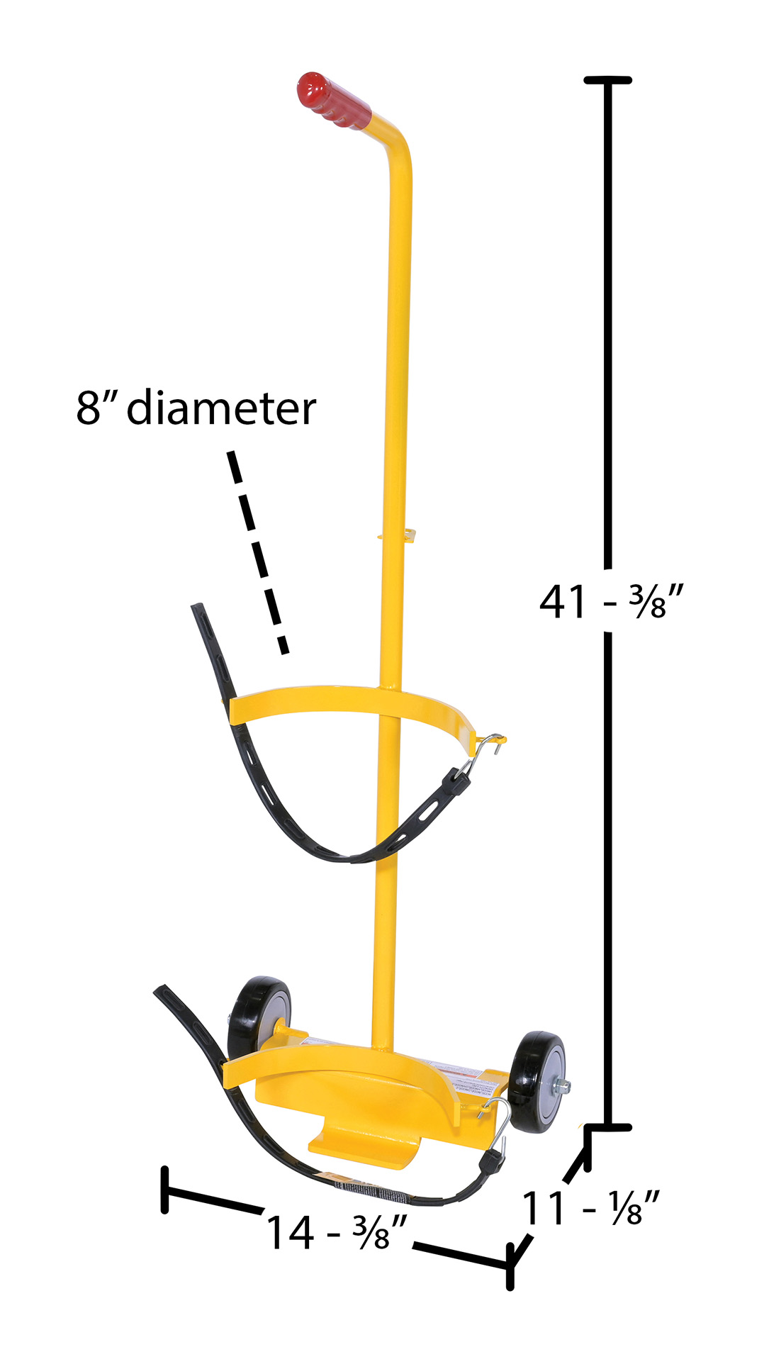 The Fire Extinguisher Carrier, model FEC-1, is designed for easily transporting your fire extinguisher up to 8" in diameter. Includes two (2) heavy duty adjustable rubber straps. Sturdy handle with rubber grip and poly casters for tilt-n-go portability. Welded steel construction with yellow baked-in powder-coat toughness. 4" x 2" stabilizing plate keeps unit upright when empty and helps retain extinguisher. Adjustable EPDM restraining straps keep extinguisher secure and allow for quick access. Wall mount bracket included to store the extinguisher off the floor.