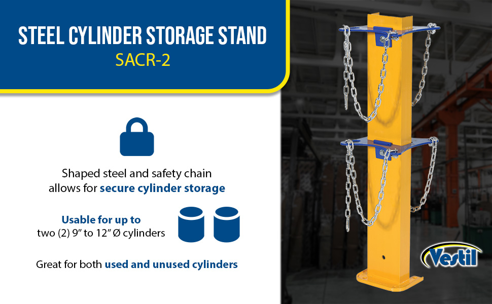 A cylinder storage stand is great for additional cylinders that are both used and unused. The sturdy steel construction with a bright yellow and blue finish endorses visibility of the unit, both near and far. Two cylinders are able to be stood in a secure position due to the shaped steel and safety chain. The unit can be secured to the floor by utilizing the pre-drilled mounting holes at the base of the stand.