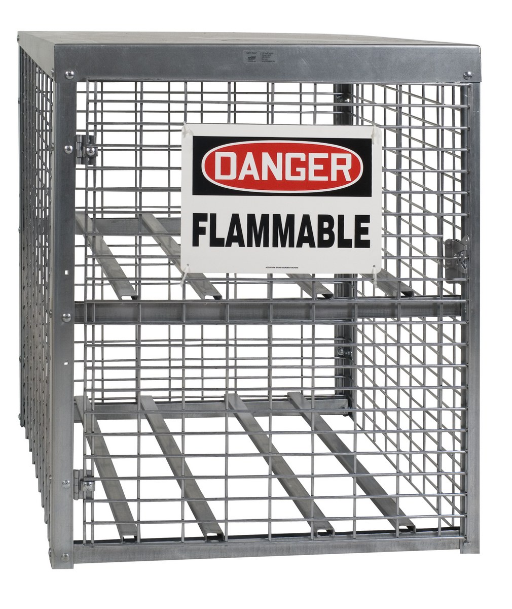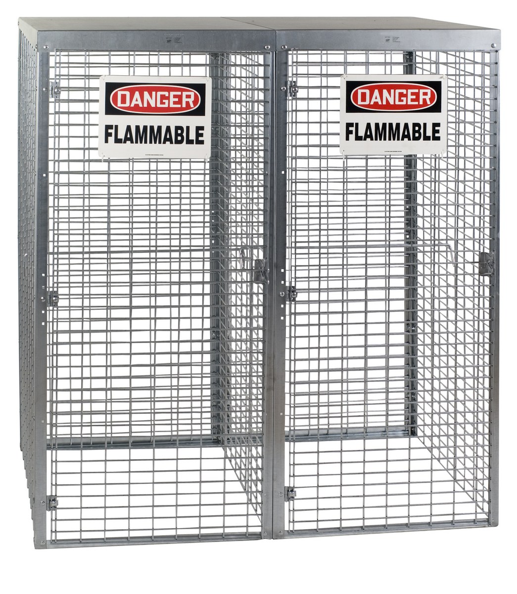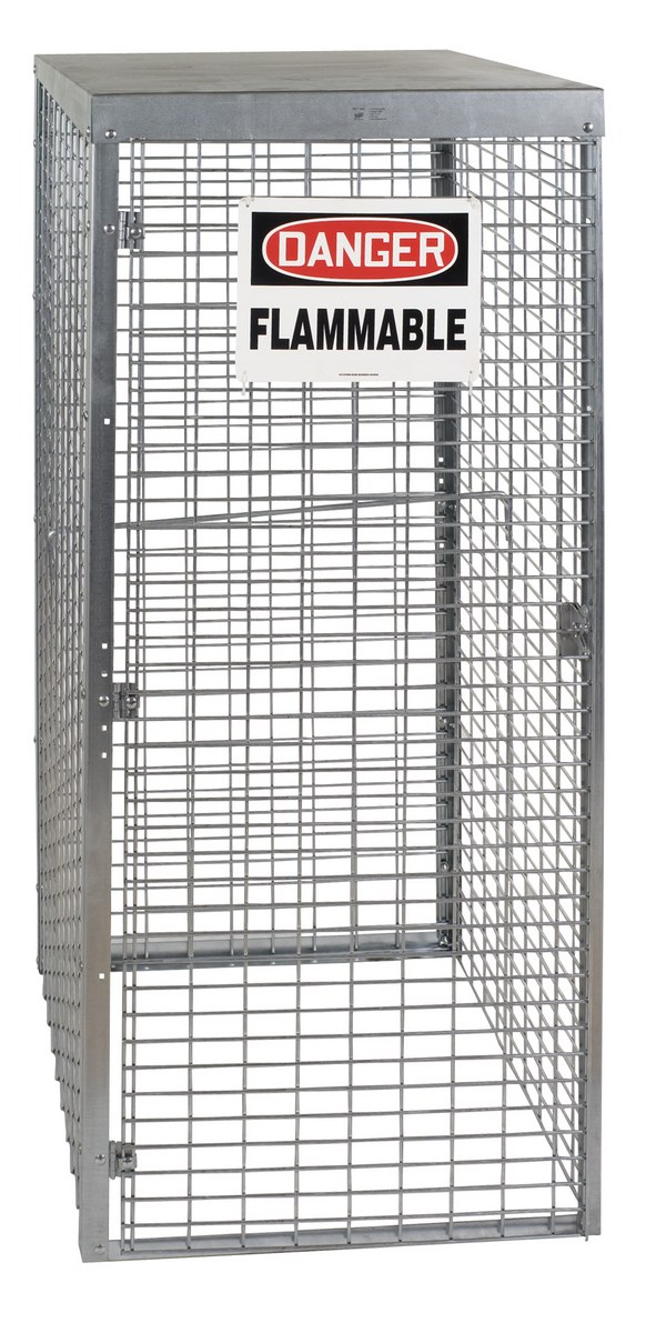 Store LP tanks horizontally and acetylene tanks vertically in these heavy-duty Cylinder Storage Cabinets. Made of all steel construction, these rust resistant units have 8 gauge galvanized welded wire sides with sturdy 1-1/2" square steel angle frames. Durable 18 gauge galvanized steel roof. The galvanized rust resistant finish stands up to harsh outdoor environments. Features a padlock hasp for security (padlock not included), "Danger Flammable Materials" sign, and all necessary hardware. Meets OSHA 1910.110 requirements. Assembly required.