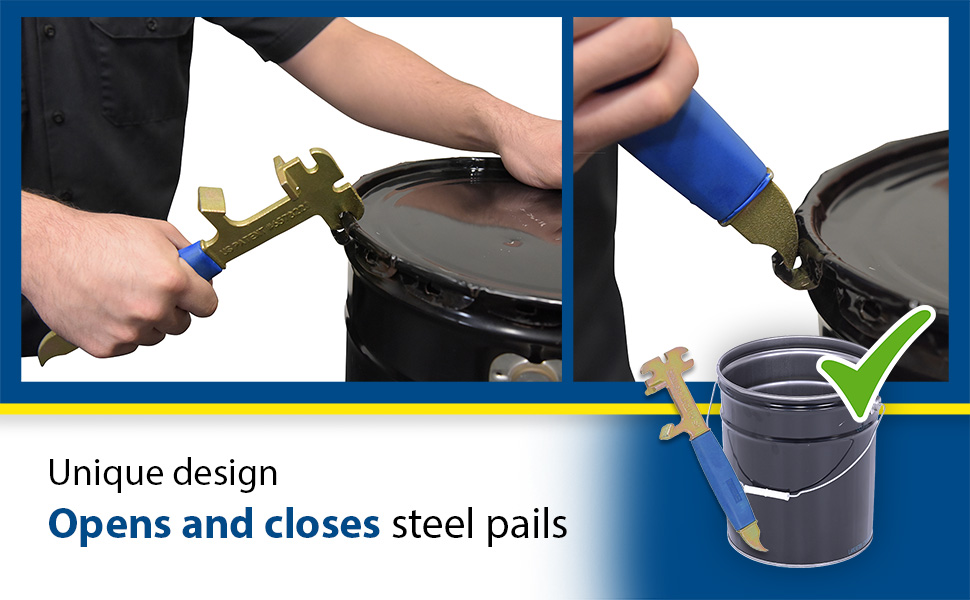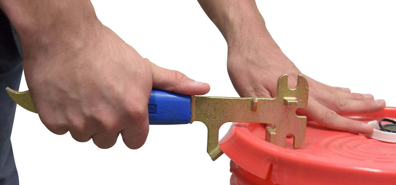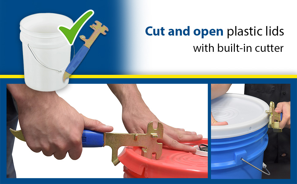 • Built-in cutting tool opens sealed lids on plastic pails