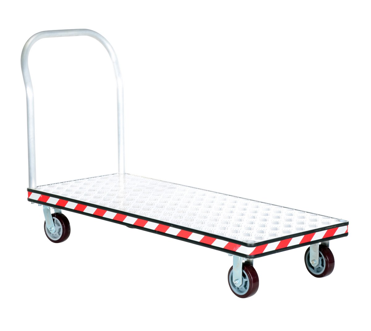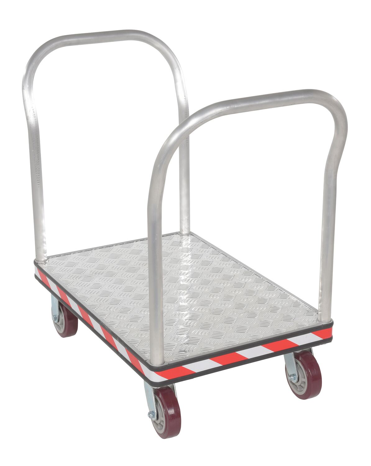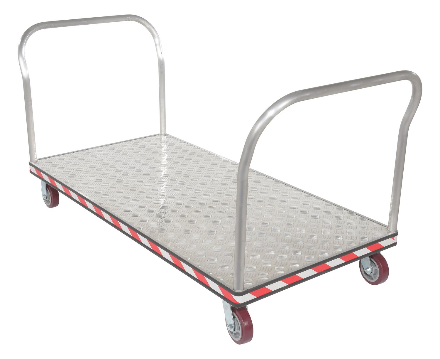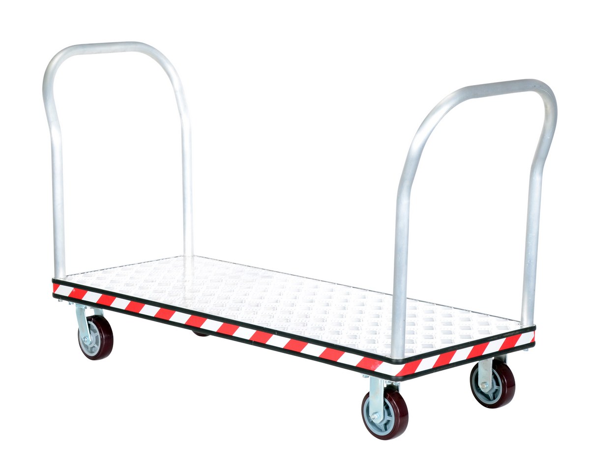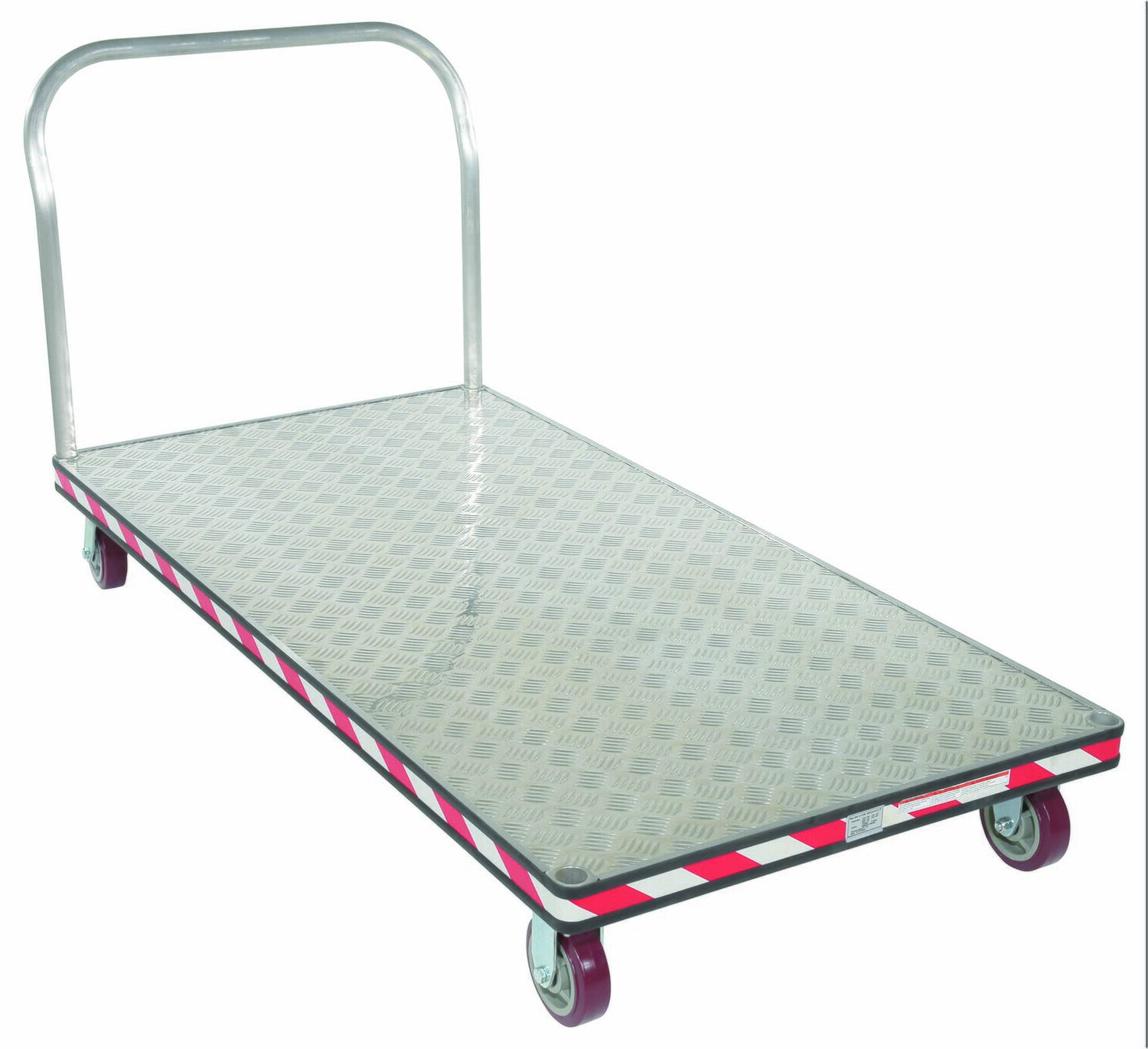 Heavy duty, extra strong, corrosion resistant platform trucks are ideal for handling all types of materials. Non-slip 5 bar aluminum tread plate. Box style frame is made of high strength welded aluminum channel. Removable aluminum handle can be placed on both or either end of the platform truck. Single or double aluminum handles available. Ergonomically designed to reduce the chance of injury, fatigue and muscle strain. Fitted with non-marking rubber protective buffer strip to protect walls and door frames during transit. Two (2) swivel and two (2) rigid 6" x 1-5/8" poly-on-poly casters. Ideal for supermarkets, food industry, schools and warehouses.