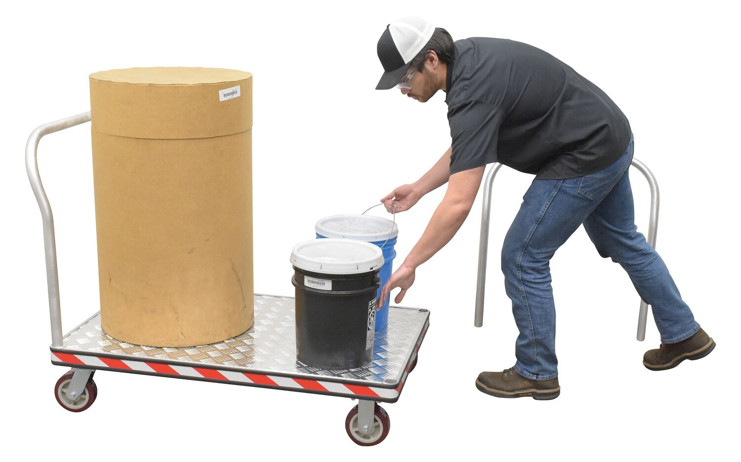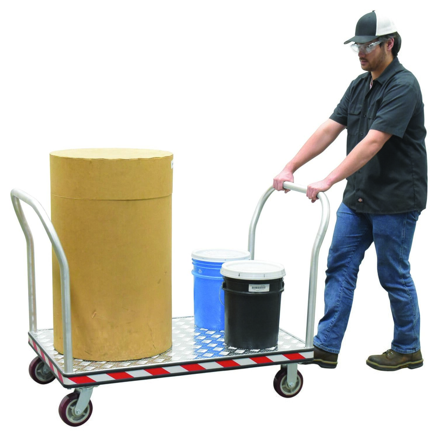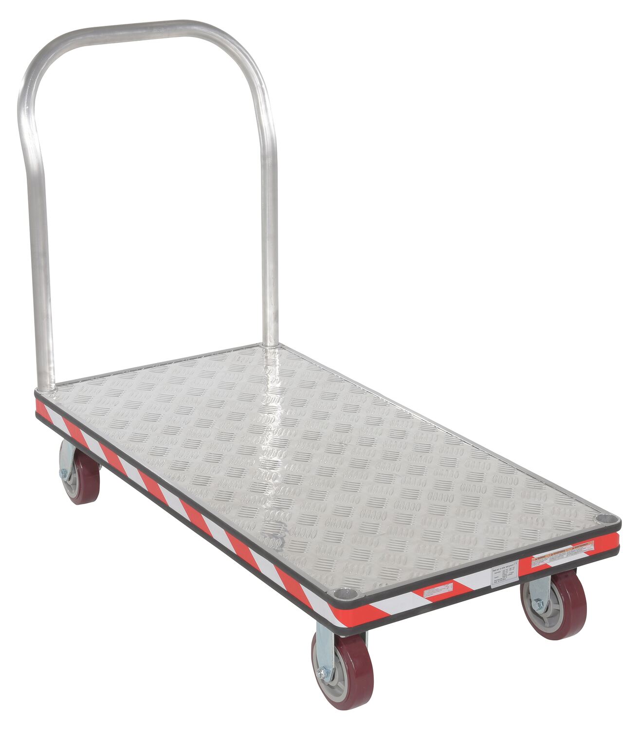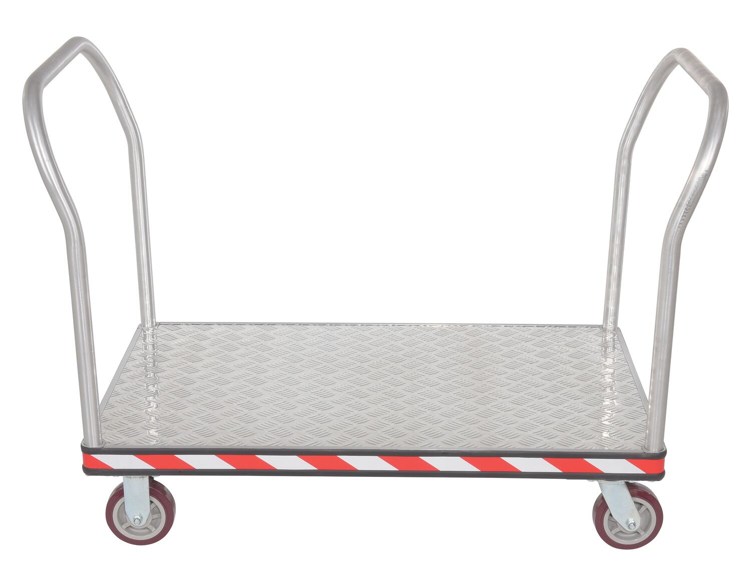 Heavy duty, extra strong, corrosion resistant platform trucks are ideal for handling all types of materials. Non-slip 5 bar aluminum tread plate. Box style frame is made of high strength welded aluminum channel. Removable aluminum handle can be placed on both or either end of the platform truck. Single or double aluminum handles available. Ergonomically designed to reduce the chance of injury, fatigue and muscle strain. Fitted with non-marking rubber protective buffer strip to protect walls and door frames during transit. Two (2) swivel and two (2) rigid 6" x 1-5/8" poly-on-poly casters. Ideal for supermarkets, food industry, schools and warehouses.