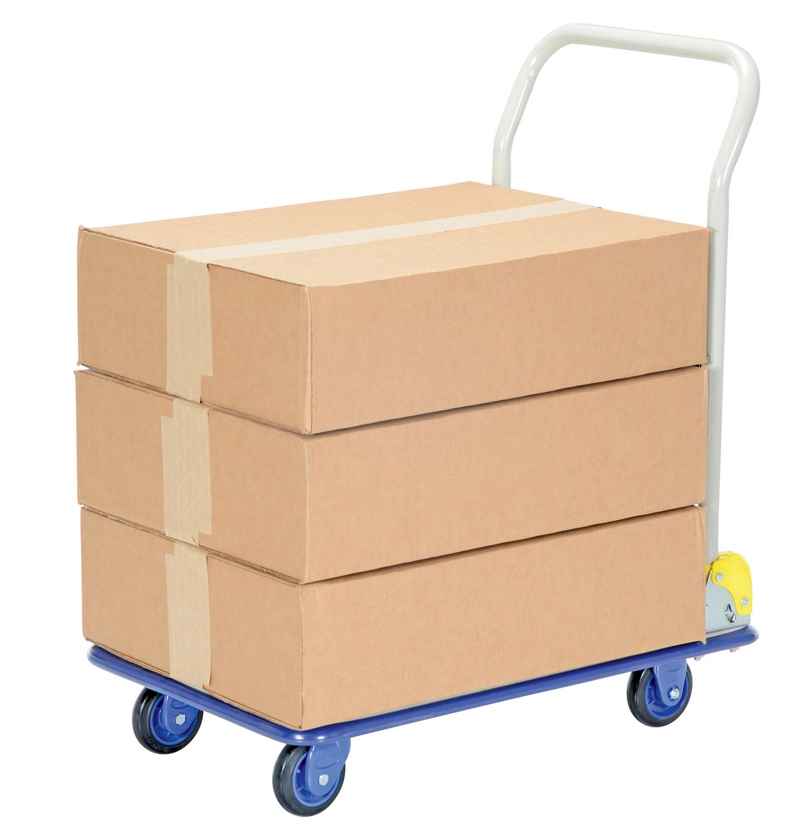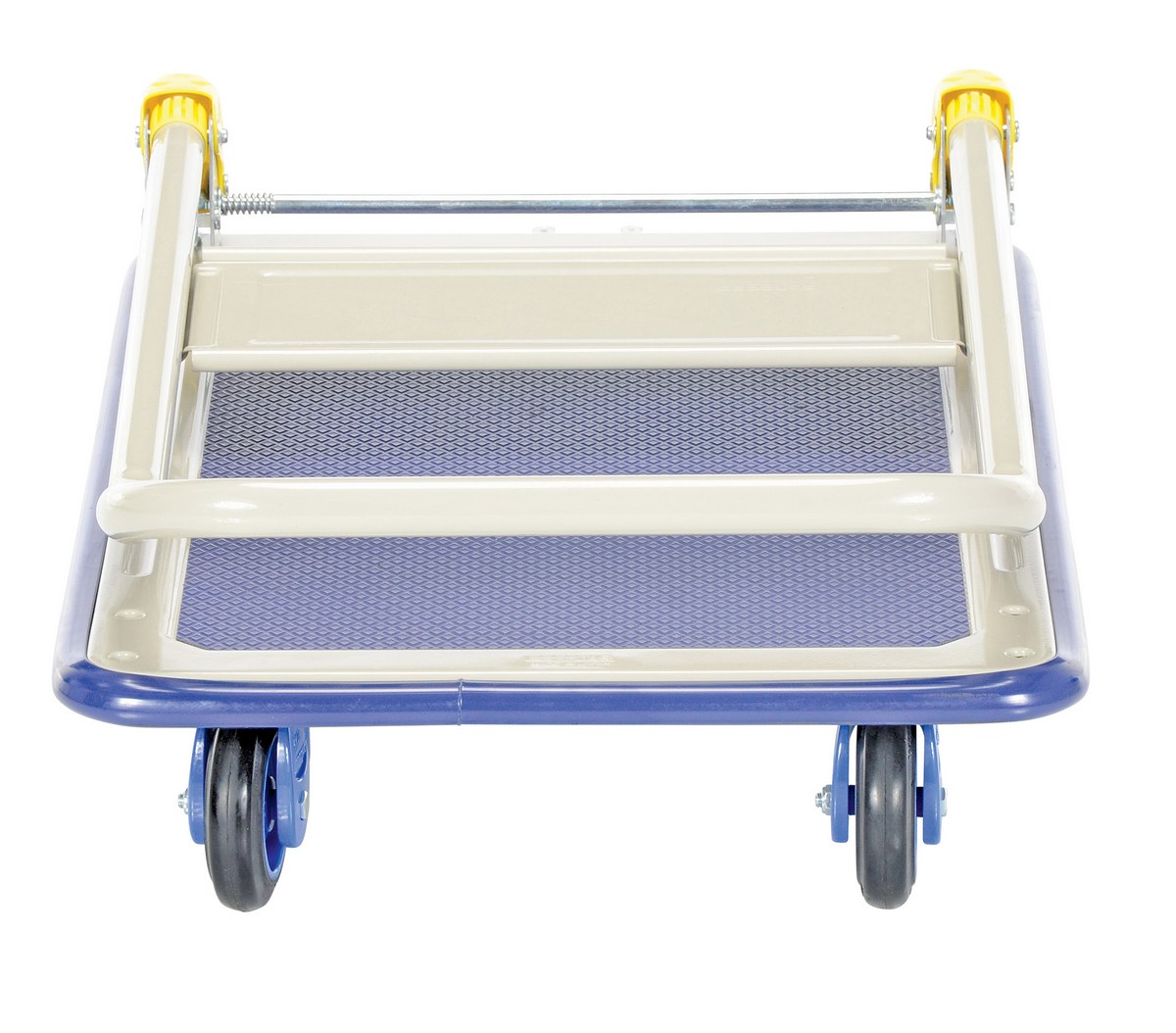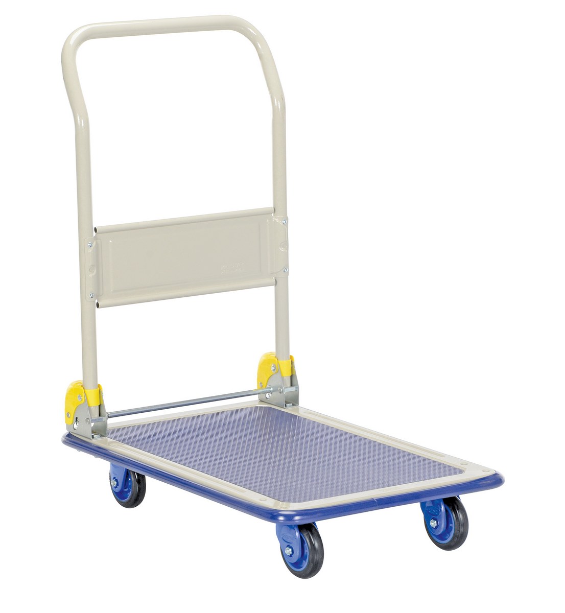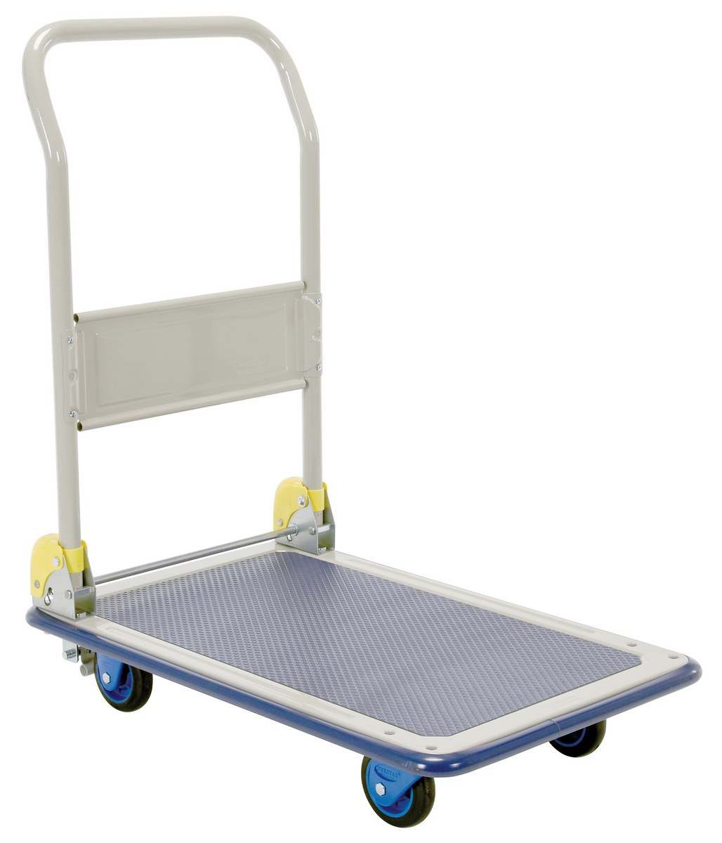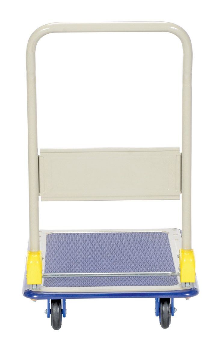 Manufactured from high quality steel. Durable pressed steel platform. Truck with a push/pull handle that folds for easy storage. Sturdy construction. Fitted with non-marking rubber protective buffer strip to protect walls and door frames when truck is in use. Non-slip PVC platform surface ensures maximum grip to eliminate movement of load when in transit. Optional front, rear, left, and right handles are available. Two (2) swivel and two (2) rigid low noise casters for sensitive environments and high quality double ball bearings. Double painted finish.