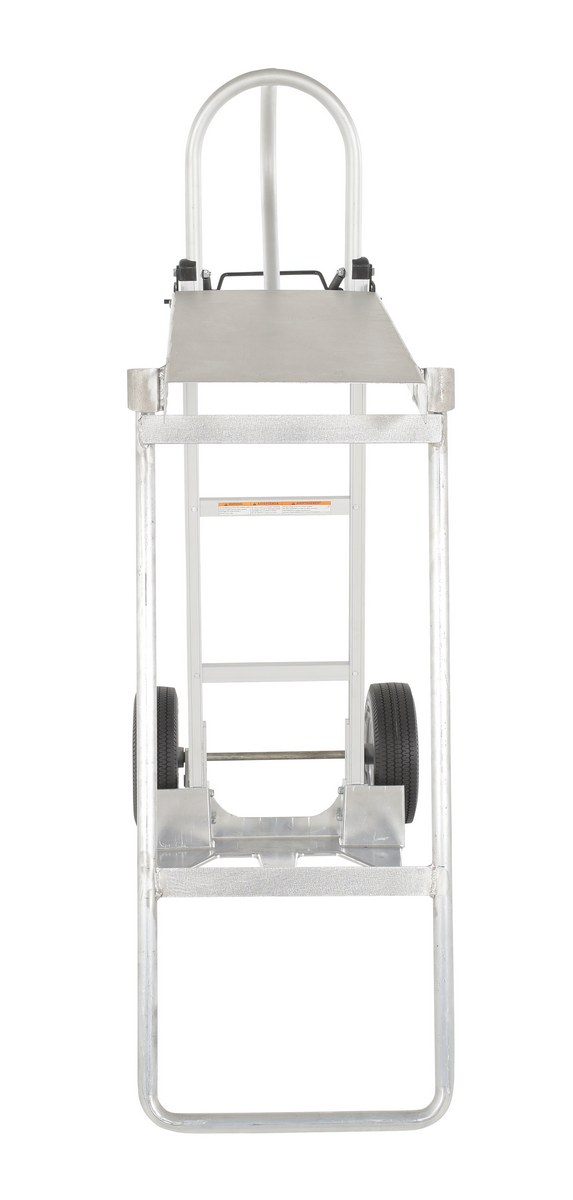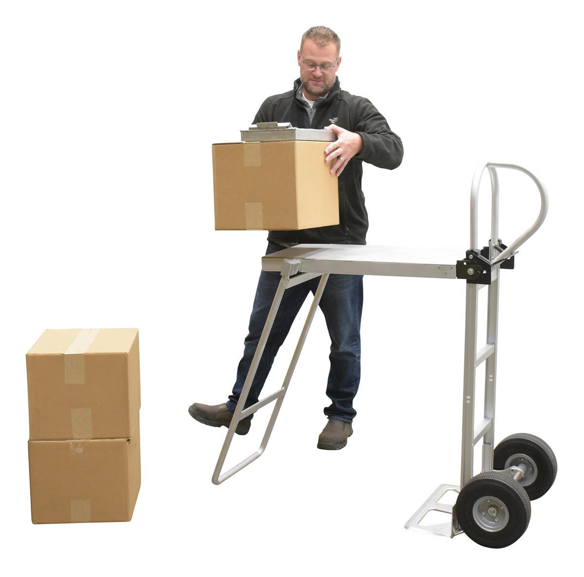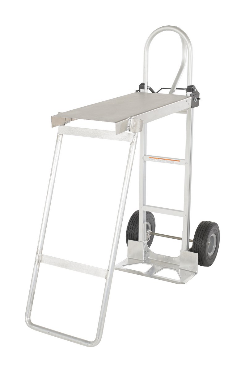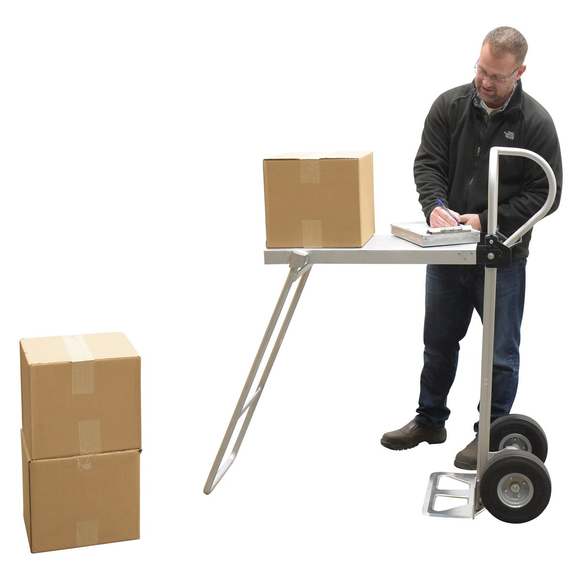 This lightweight aluminum hand truck features an integral work bench. Work bench conveniently folds flat for storage. Now a sturdy work bench can be moved to where it is needed most. Provides for a more comfortable and ergonomically correct work position. P-handle design allows for easy maneuverability. Hand truck rolls smoothly on 10" wheels. Nose plate, while in the hand truck position, is 7-1/2" x 18". Uniform capacity of cart is 500 pounds and shelf capacity is 100 pounds. Assembly required.