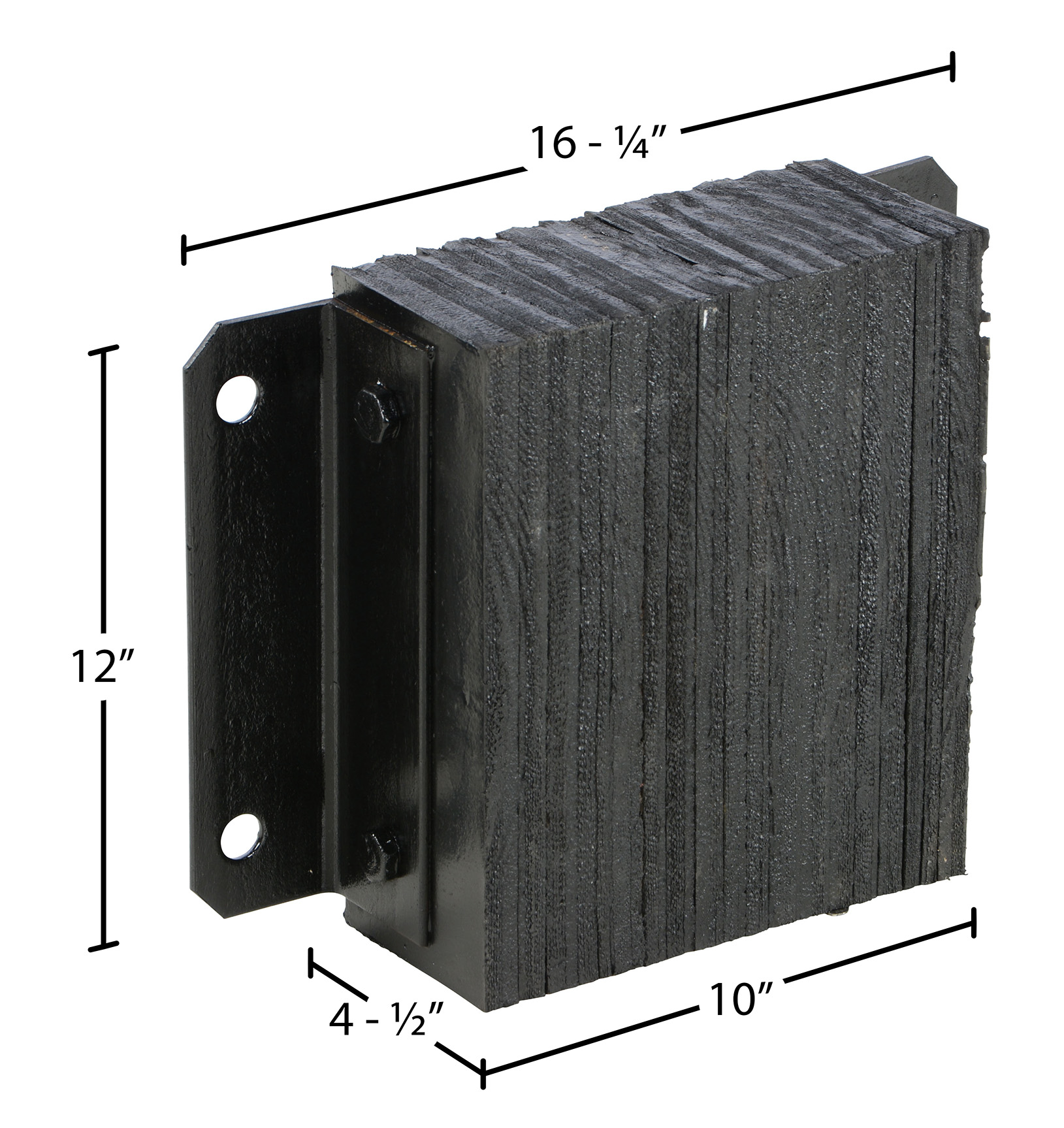 Laminated Rubber Dock Bumper 12 In. x 14 In. x 4-1/2 In. BlackThe laminated Dock Bumper provides durable, economical protection for loading docks and trailers. This unit is constructed of fabric reinforced rubber from recycled truck tires. The pads are laminated between painted structural angles and held together with steel tie rods. The width is bolt hole center to bolt hole center. Installation hardware sold separately.