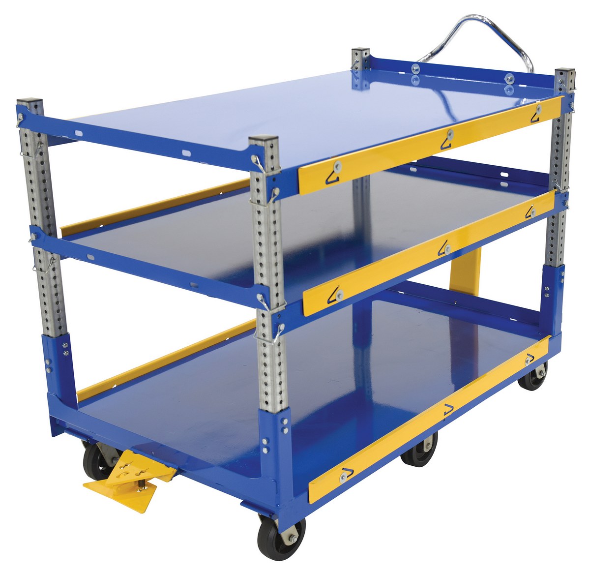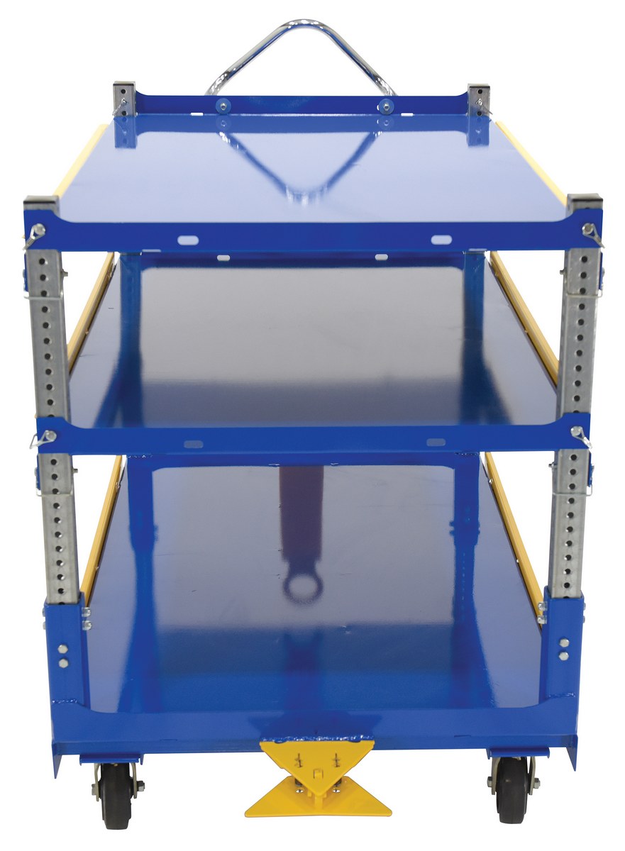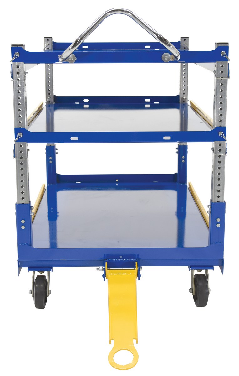 Steel Ergo Cart with Adjustable Shelves and Mold On Rubber Casters 72-1/8 In. x 37-5/16 In. x 49-5/16 In. 3,000 Lb. Capacity BlueThe adjustable ergonomic cart is the perfect asset to a number of facilities including shipping and handling to hospitality. A strong construction with a tall handle diminishes bending and twisting while loading and unloading products. The top two tiers can be adjusted in height with a simple pull of a pin to let larger sized products be transferred securely. The unit rolls on mold-on rubber casters for a smooth transition.