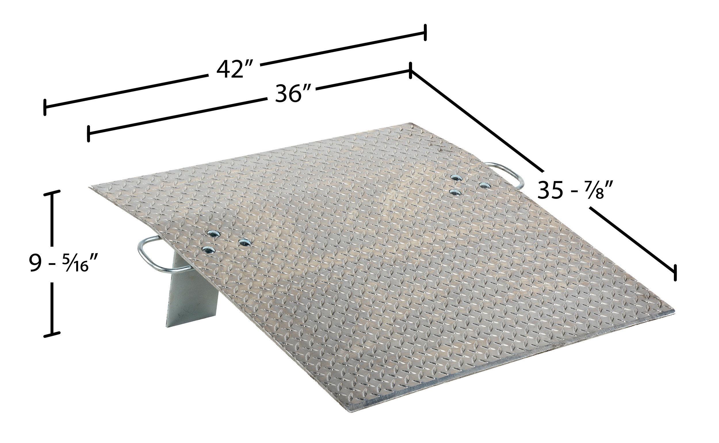 Aluminum Hand Truck Dock Plate 36 In. x 36 In. 700 Lb. Capacity SilverThis Aluminum Hand Truck dock plate is designed for use with two (2) wheel hand trucks. It is a convenient, safe, and easy way to access loading docks from trucks. This dock plate is lightweight and easily transported by just one person. The tread plate surface ensures skid-resistant safe traction and the locking legs secure the plate for safe loading and unloading. Complete with bolt-on zinc plated carrying handles and locking legs.