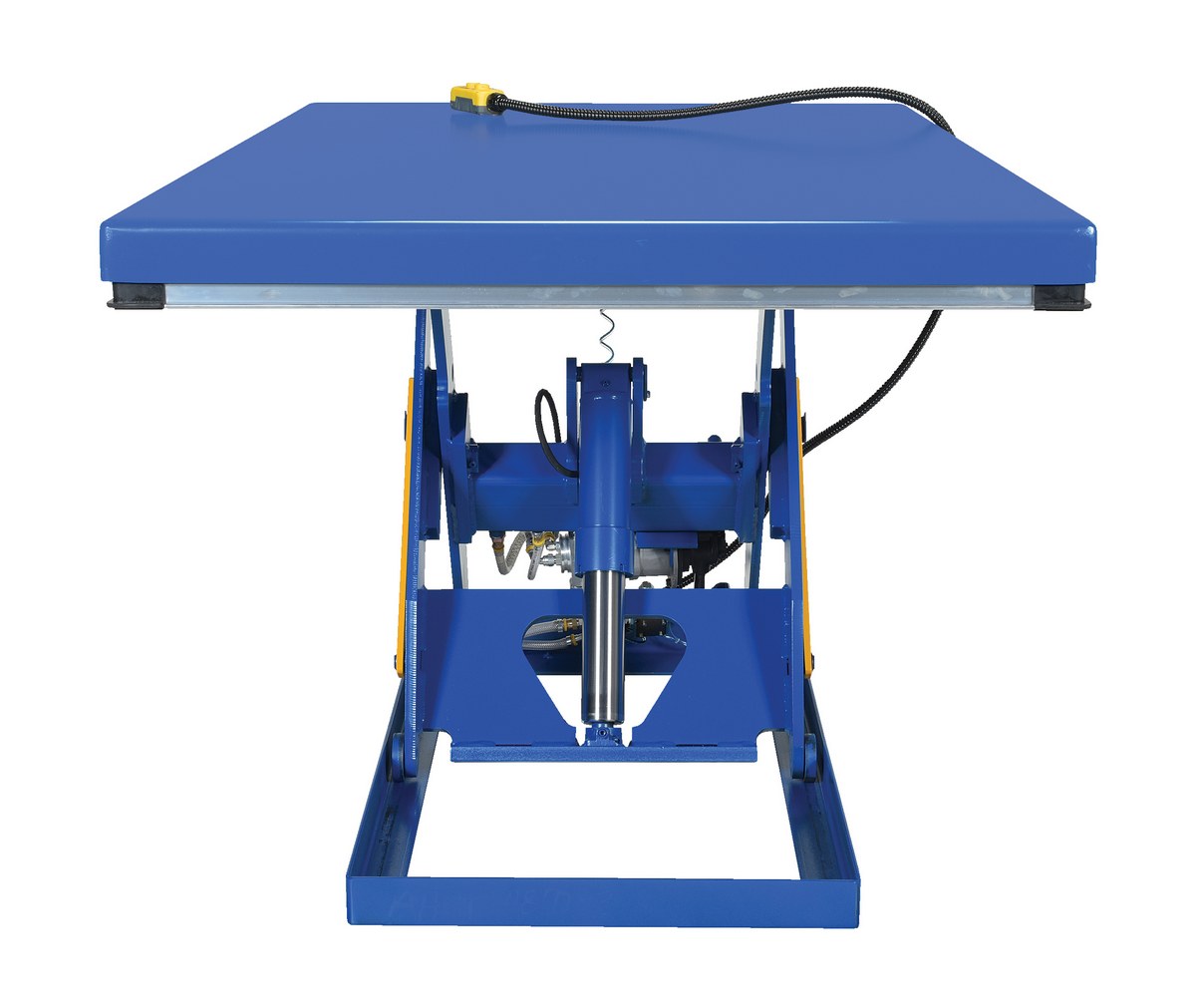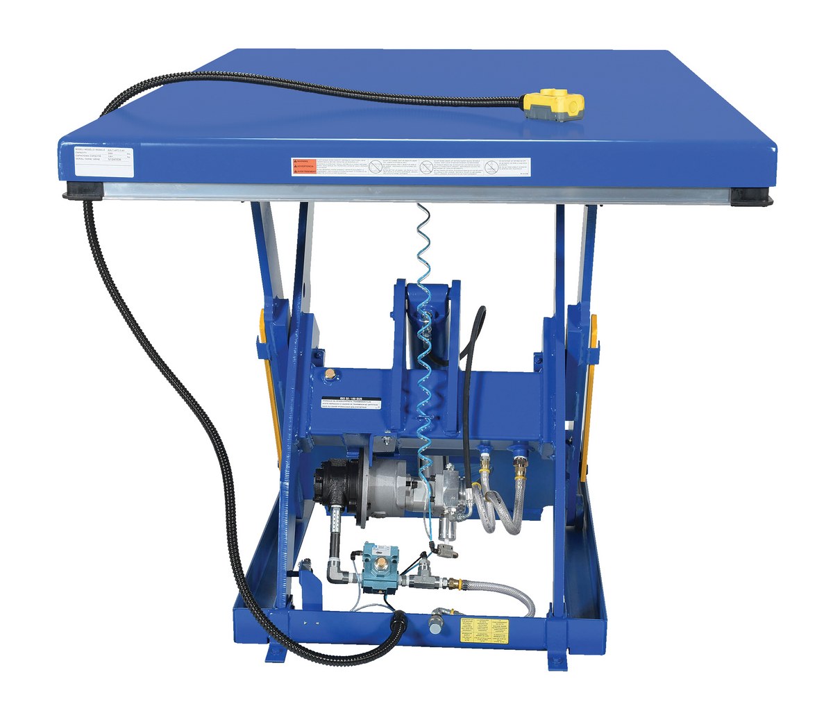 Steel Rotary Air Hydraulic Scissor Lift Table 48 In. x 72 In. 3,000 Lb. Capacity BlueThe rotary air/Hydraulic scissor lift table utilizes the convenience of factory air to power the lift table. Simply connect to an air supply through a filter, regulator, lubricator, and you will have a lift table suitable for a wide range of applications and operating environments. It features a pneumatic upper travel limit switch, safety toe guards, cylinder with internal safety velocity fuse, two button hand control, and life-time lubricated sleeve bearings.