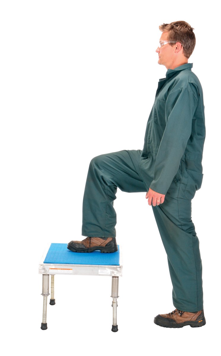 The adjustable work-mate stand minimizes fatigue by elevating workers to heights that are comfortable and ergonomically correct. Especially useful when multiple shift employees operate the same piece of machinery. The ergonomic matting deck style provides comfort for the operator who stands all day. The height of each leg can be adjusted individually to ensure proper working height.