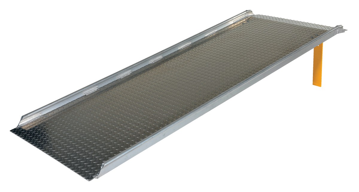 Aluminum Diamond Tread Hand Truck Dock Board with Curbs 95-7/8 In. x 37-1/4 In. x 19-1/8 In. 800 Lb. Capacity SilverThe Aluminum Hand Truck dock boards are lightweight and can be carried and positioned by one person. Provides a safe and convenient bridge between dock and truck. Welded aluminum diamond tread surface and beveled edges provide safe and smooth entry and exit. The bend is designed to keep ramp edges flush with the dock surface and the truck floor. The unit is equipped with bolt-on locking legs and full length aluminum curbs that provide hand holds and reduce chance of roll off. Designed for use with two wheel hand trucks.