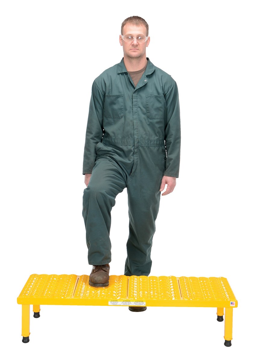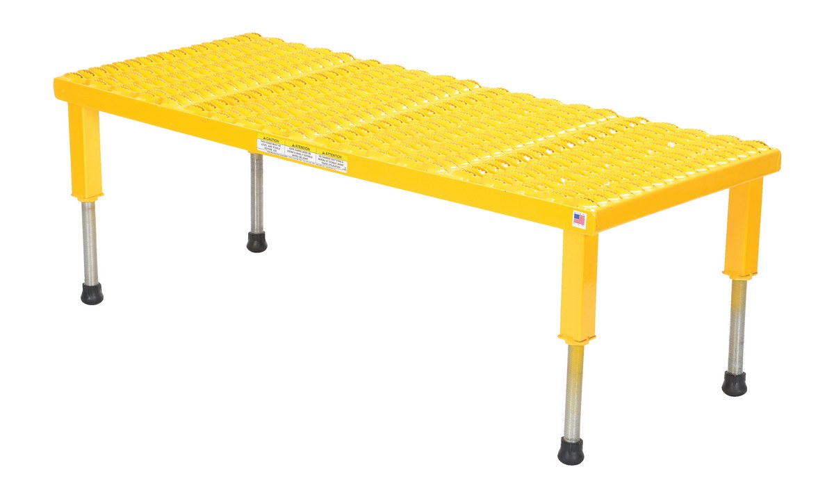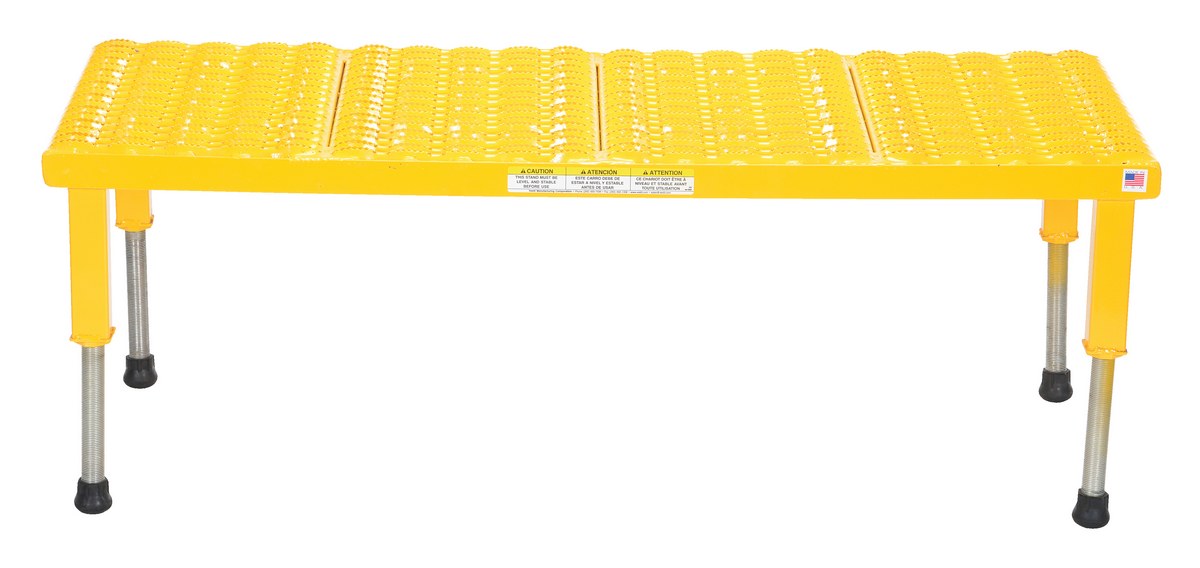 Steel Adjustable Work-Mate Stand 47 In. x 19-9/16 In. x 10-1/2 In. 500 Lb. Capacity YellowThe adjustable work-mate stand minimizes fatigue by elevating workers to heights that are comfortable and ergonomically correct. Especially useful when multiple shift employees operate the same piece of machinery. The height of each leg can be adjusted individually to ensure proper working height.