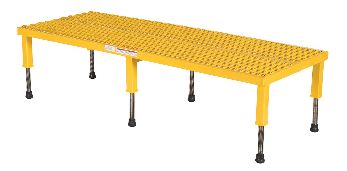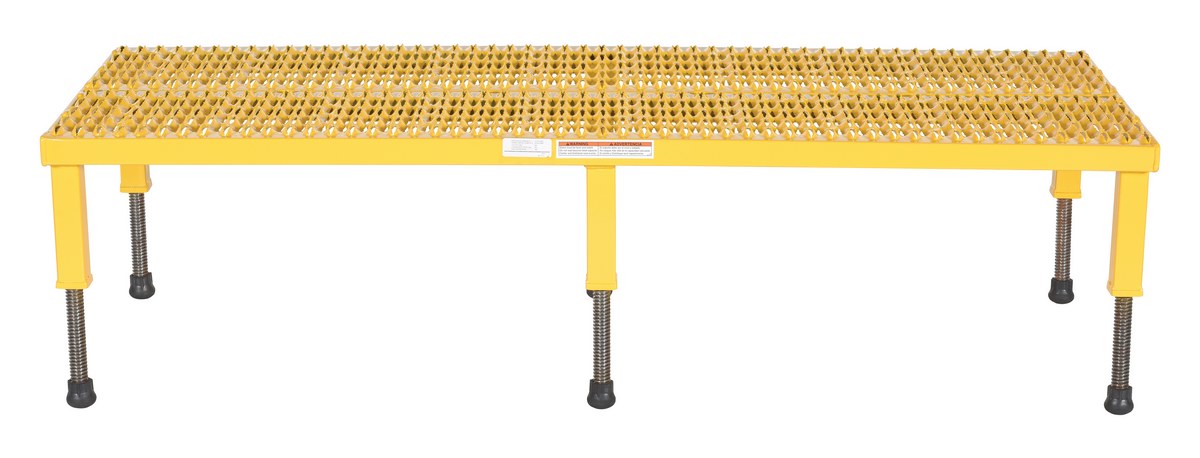 Steel Adjustable Work-Mate Stand 60 In. x 23-1/2 In. x 10-1/2 In. 500 Lb. Capacity YellowThe adjustable work-mate stand minimizes fatigue by elevating workers to heights that are comfortable and ergonomically correct. Especially useful when multiple shift employees operate the same piece of machinery. The height of each leg can be adjusted individually to ensure proper working height.
