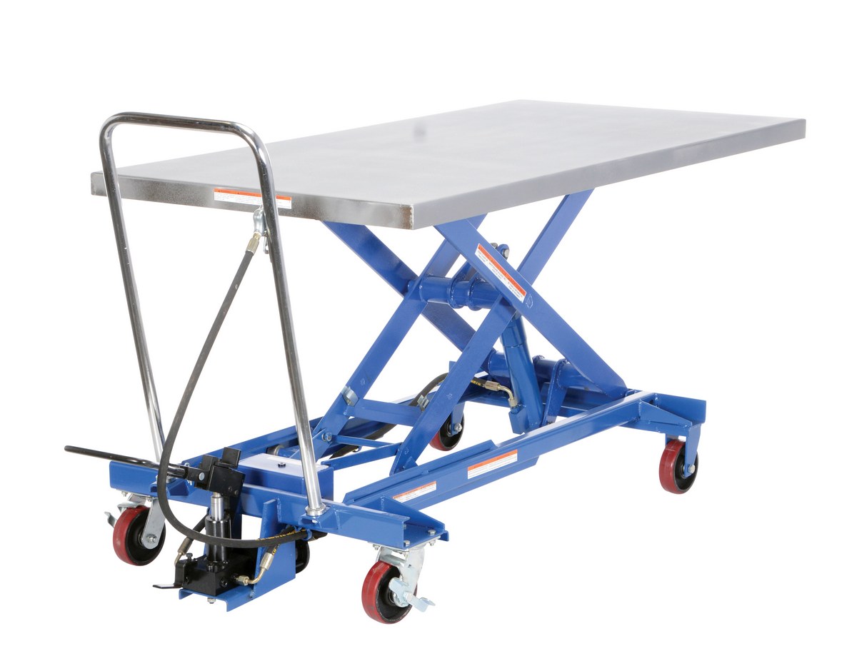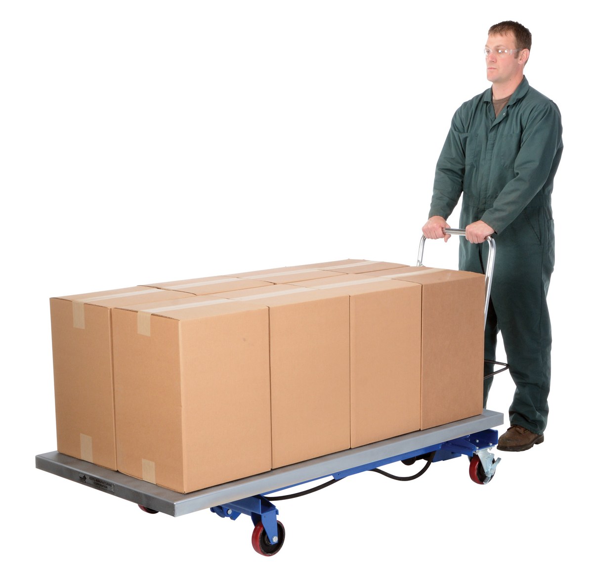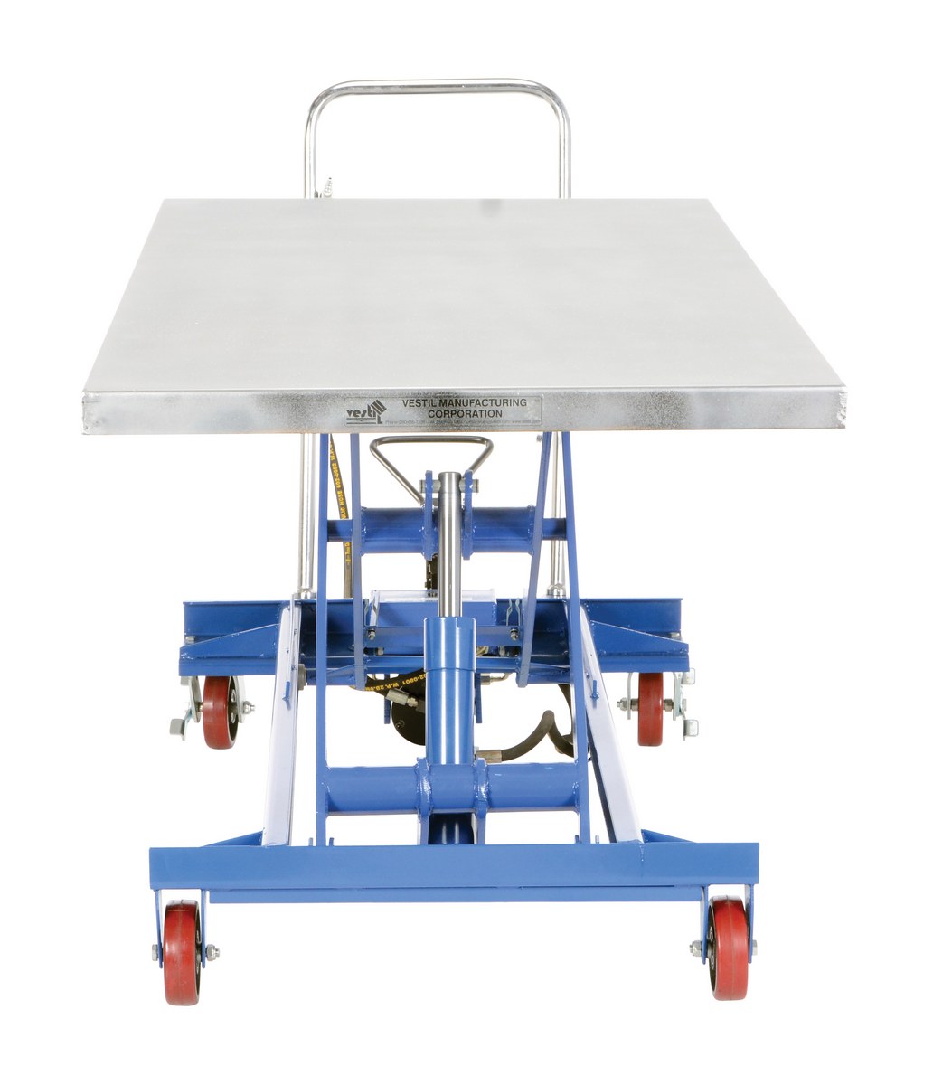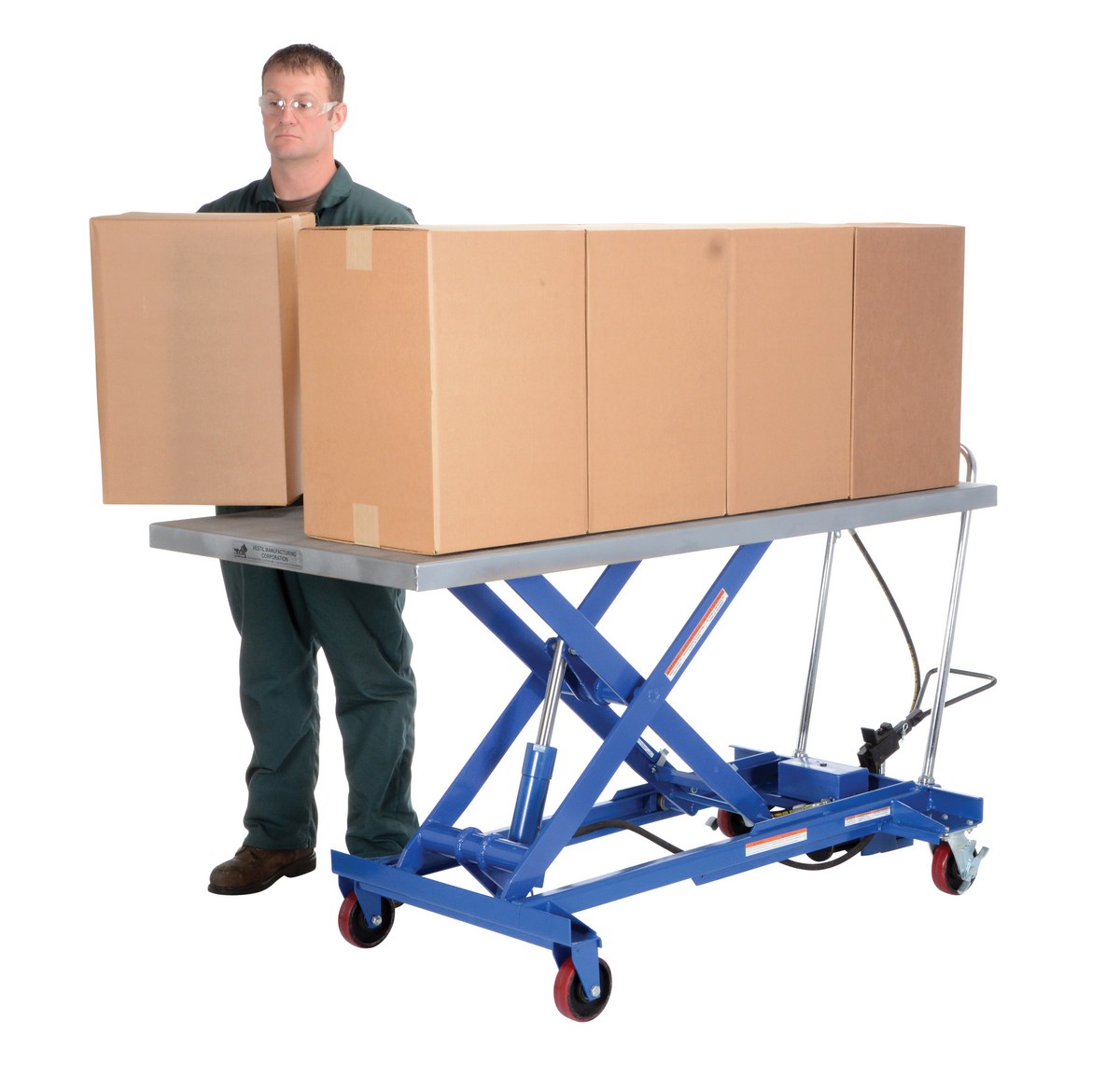Carbon Steel Air/Hydraulic Light Duty Scissor Lift Cart 63 In. x 31-1/2 In. Platform With Poly-On-Poly Casters 1,000 Lb. Capacity Blue/SilverThe air Hydraulic cart features a two speed foot pump and hand held reciprocating air/oil power to raise the platform. It utilizes the two speed foot pump for minor height adjustments and the factory air/oil power for effortless lifting.