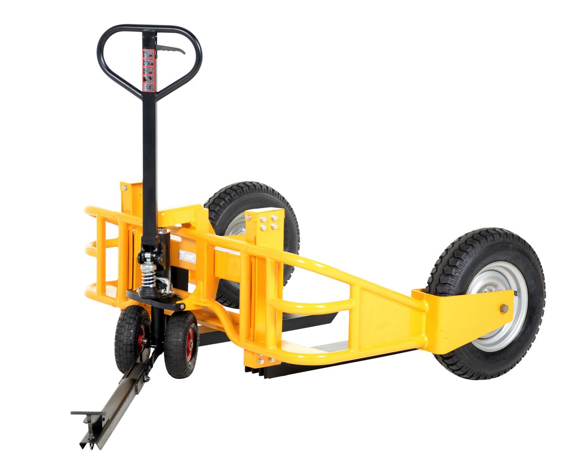 Optional tow bar Package allows the all terrain pallet truck to be towed by an ATV or small utility tractor. It's designed for pulling in either loaded or unloaded position. For storage purposes, a yellow nylon pulling strap is included.