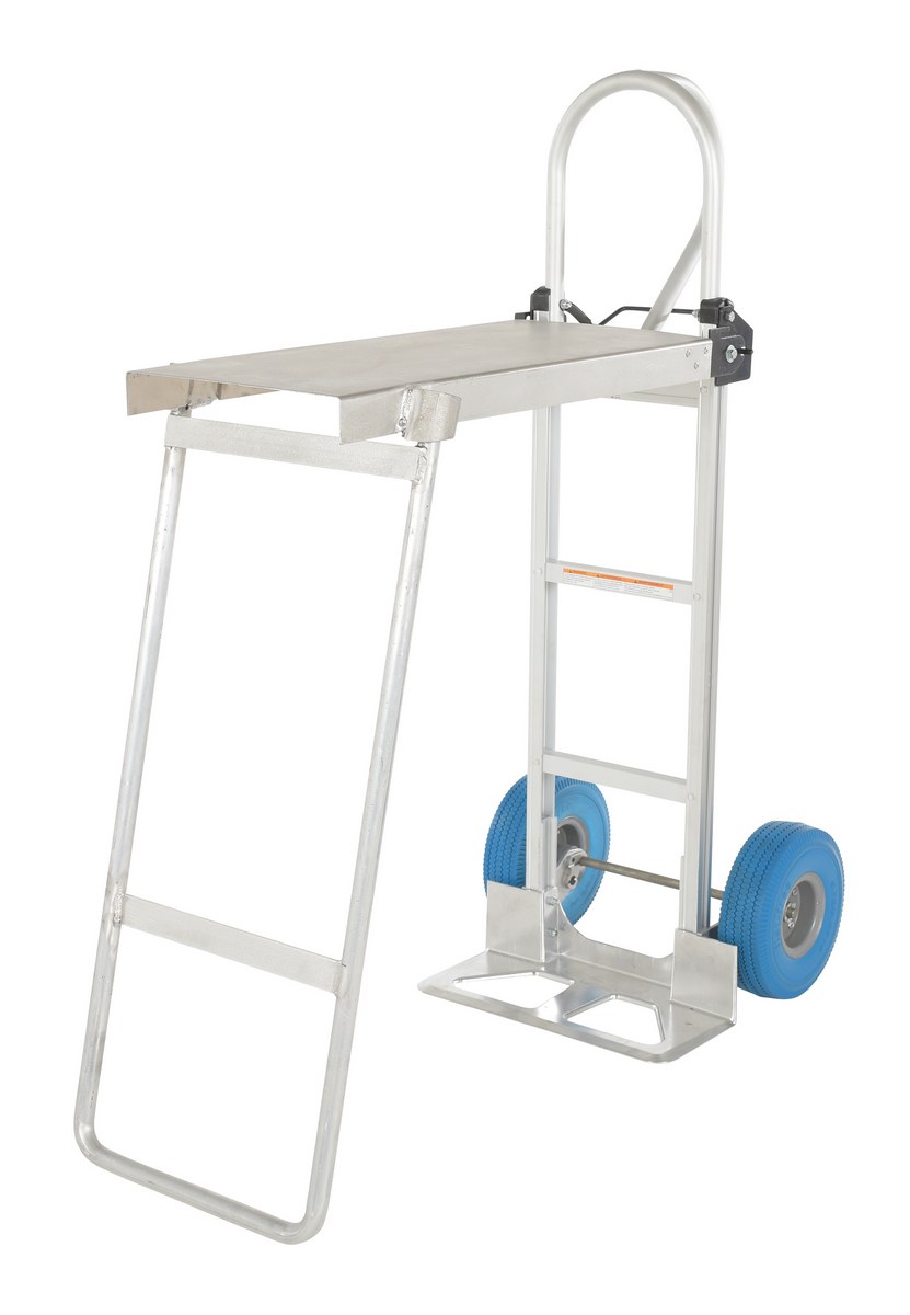 Aluminum P Handle Hand Truck with Folding Down Platform Blue Urethane Solid Foam 48 In. x 20-13/16 In. x 50-3/4 In. 500 Lb. Capacity SilverThis lightweight aluminum hand truck features an integral work bench. Work bench conveniently folds flat for storage. Now a sturdy work bench can be moved to where it is needed most. Provides for a more comfortable and ergonomically correct work position. P-handle design allows for easy maneuverability.