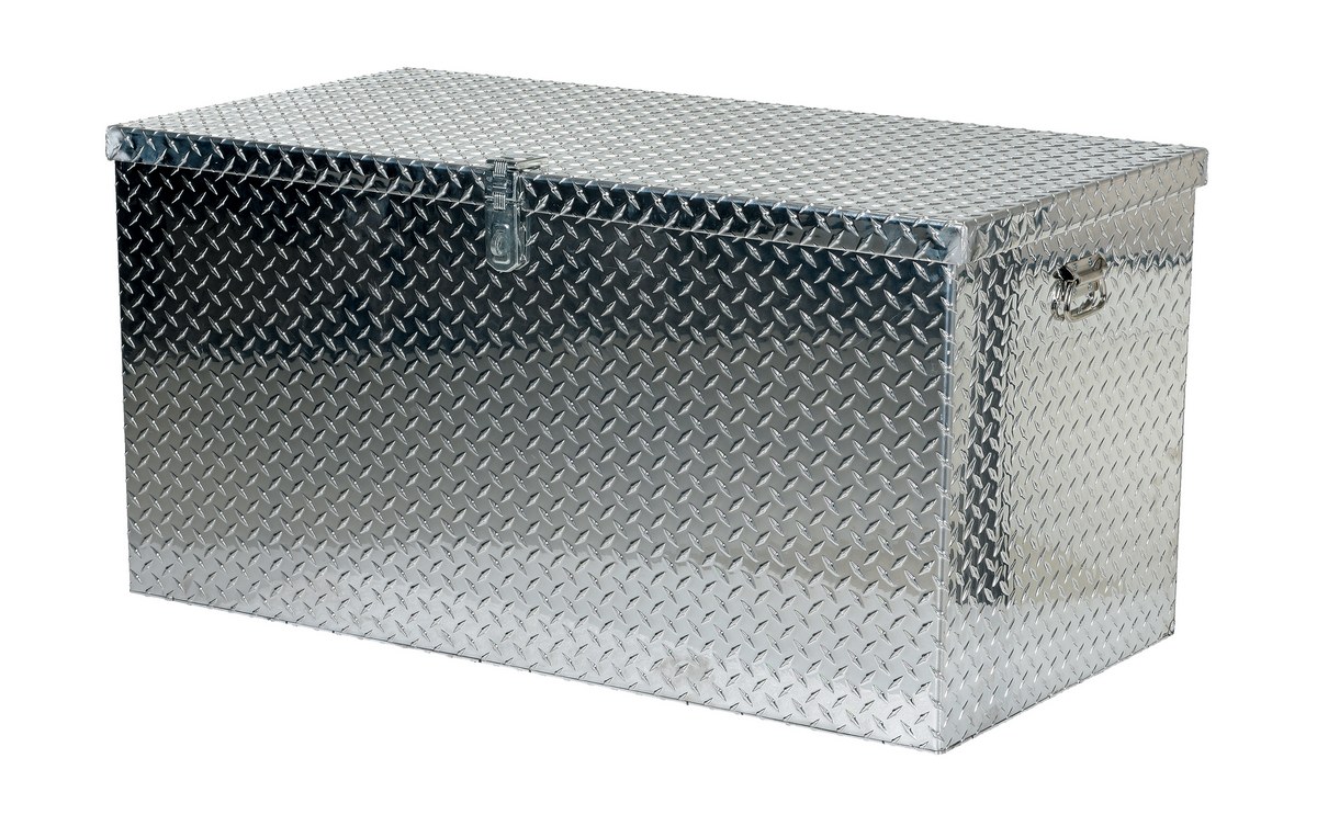 Aluminum Portable Tool Box 25-7/8 In. x 49-1/4 In. x 25-1/16 In. 2500 Lb. Capacity SilverSecure your tools and other belongings from theft with this Aluminum Tread Plate portable tool box. There is a safety double hinged hasp for padlock securing with padlock not included. Constructed of diamond tread plate material. Features two (2) sturdy handles for transporting.
