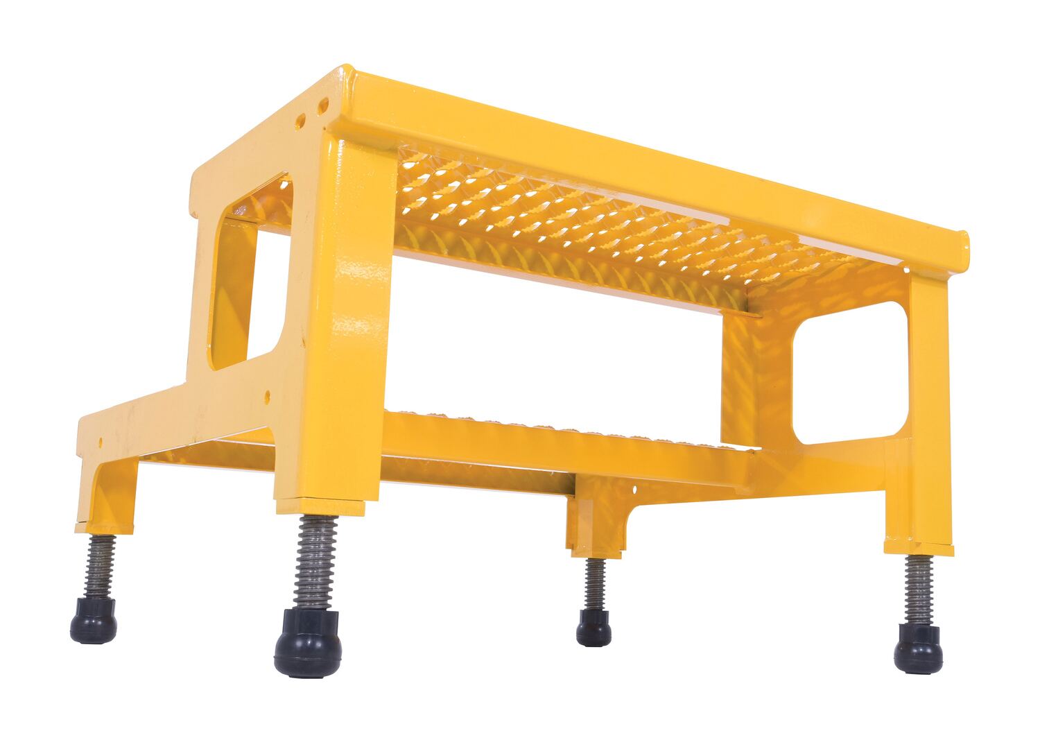 Steel Adjustable Step Mate Stand 2 Step 22-7/8 In. x 23-13/16 In. x 15-1/4 In. 500 Lb. Capacity YellowThe adjustable step-mate stand can be used as either a comfortable worker platform or a semi-permanent step. The serrated surface ensures safe footing. The legs adjust individually by screwing them into or out of the leg base.