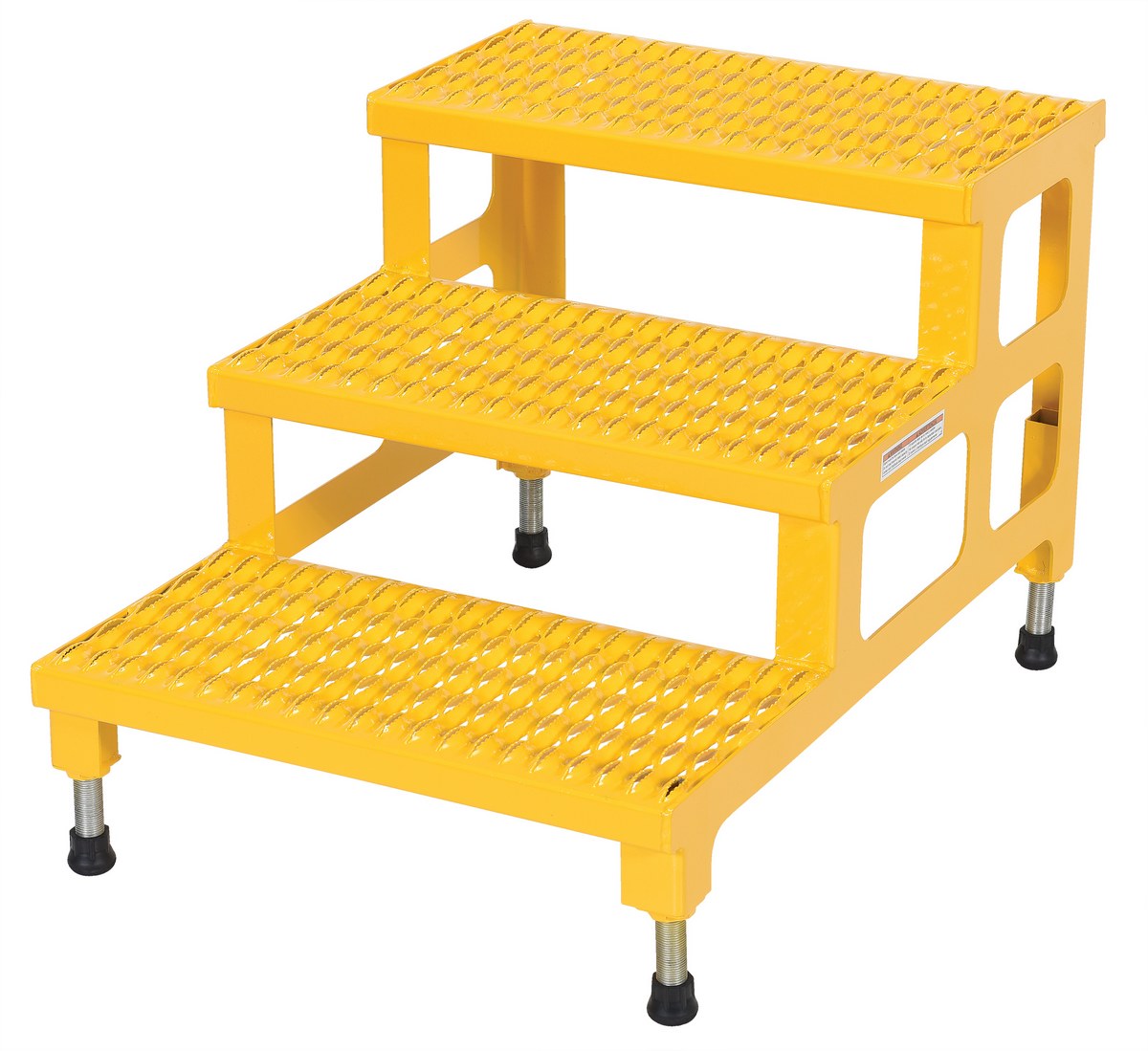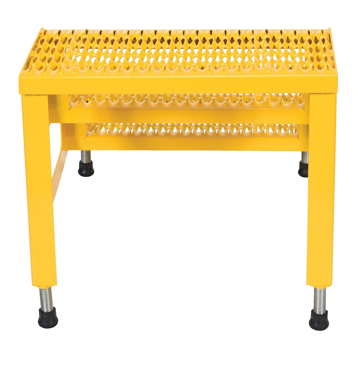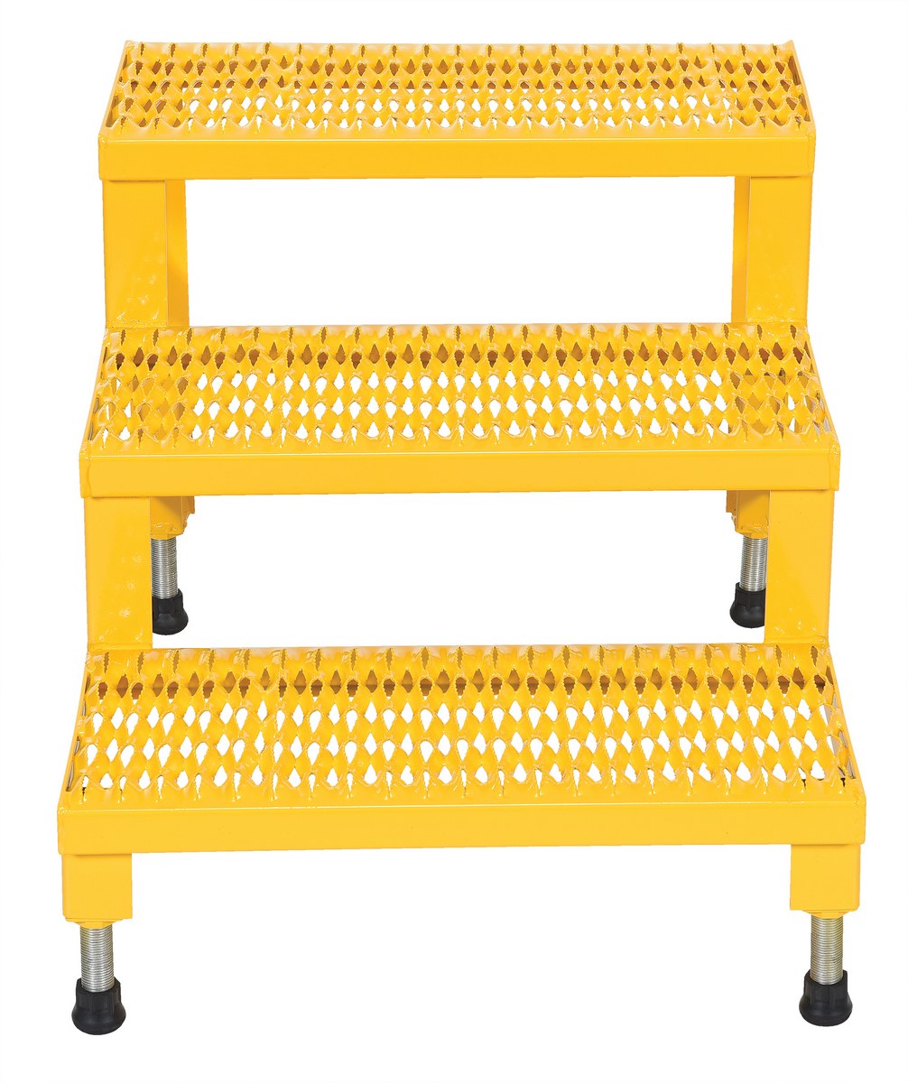 Steel Adjustable Step Mate Stand 3 Step 33-7/8 In. x 23-13/16 In. x 22-1/4 In. 500 Lb. Capacity YellowThe adjustable step-mate stand can be used as either a comfortable worker platform or a semi-permanent step. The serrated surface ensures safe footing. The legs adjust individually by screwing them into or out of the leg base.
