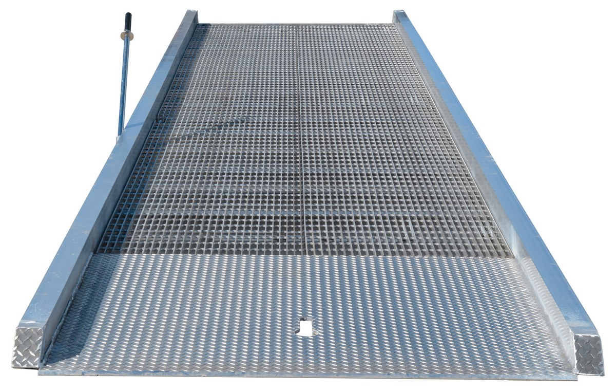 The portable Aluminum Yard Ramp with Aluminum grating has a unique design that allows one person to position the ramp, adjust its service height, and load or unload trailers from ground level. Grating is rust resistant aluminum. It includes hand pump hydraulic lift, safety pressure relief valve, anchor chains, and tow bar pocket.