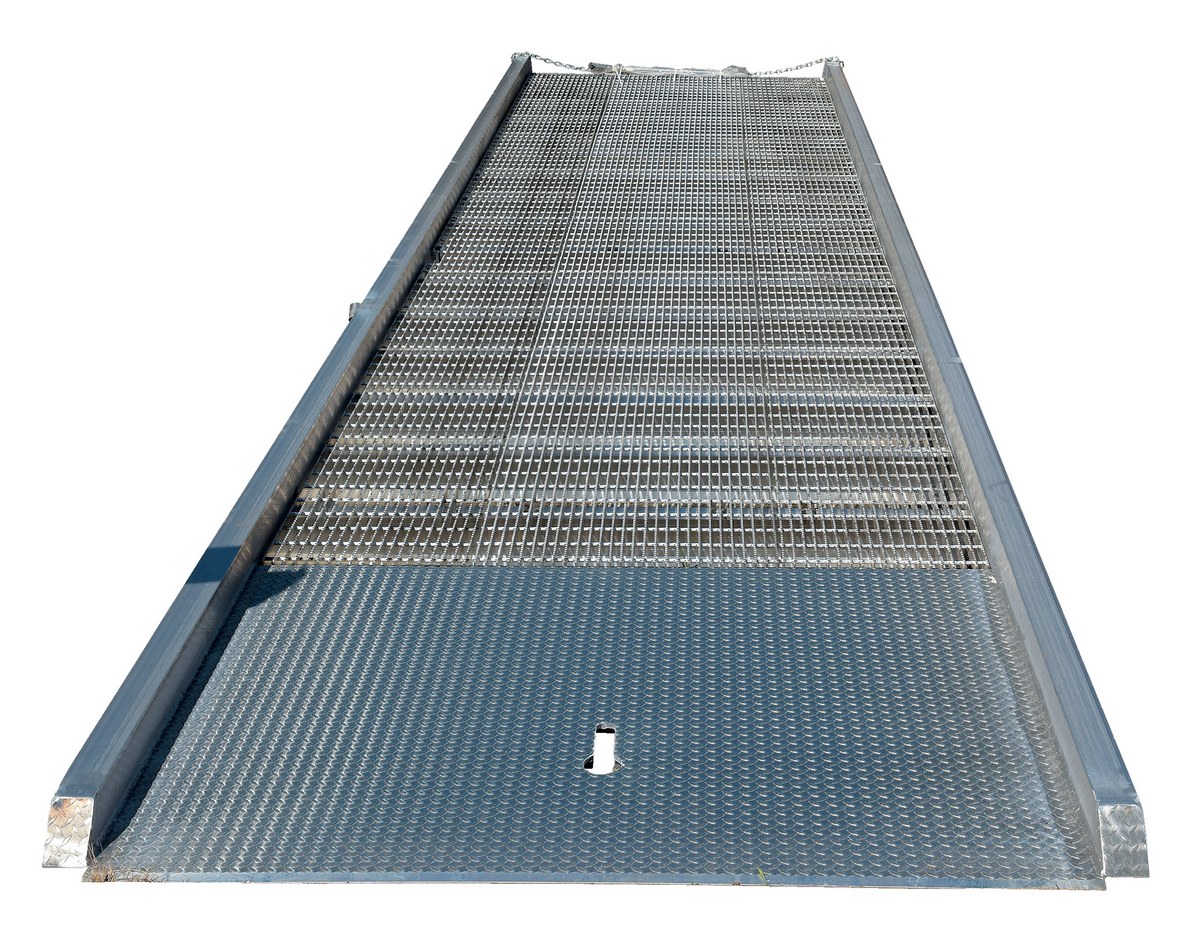 The portable Aluminum Yard Ramp with Aluminum grating has a unique design that allows one person to position the ramp, adjust its service height, and load or unload trailers from ground level. Grating is rust resistant aluminum. It includes hand pump hydraulic lift, safety pressure relief valve, anchor chains, and tow bar pocket.