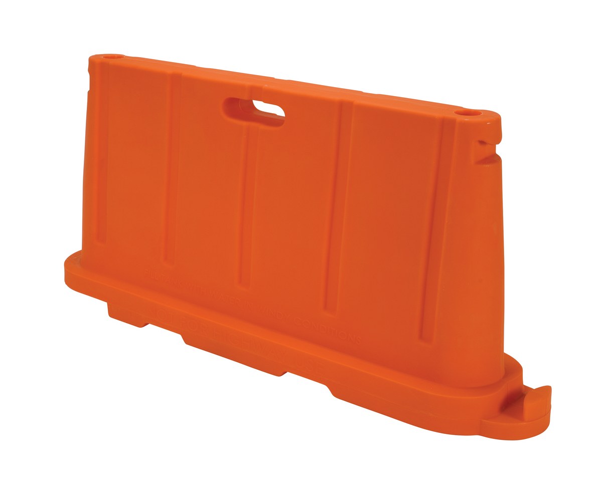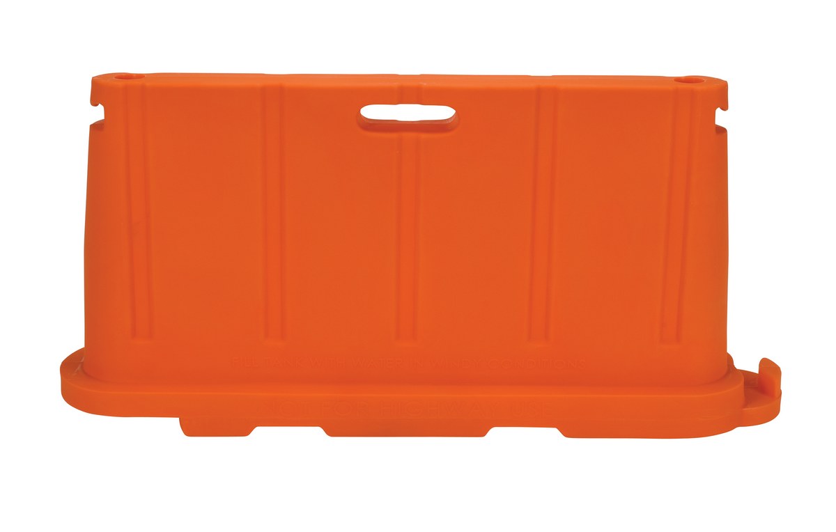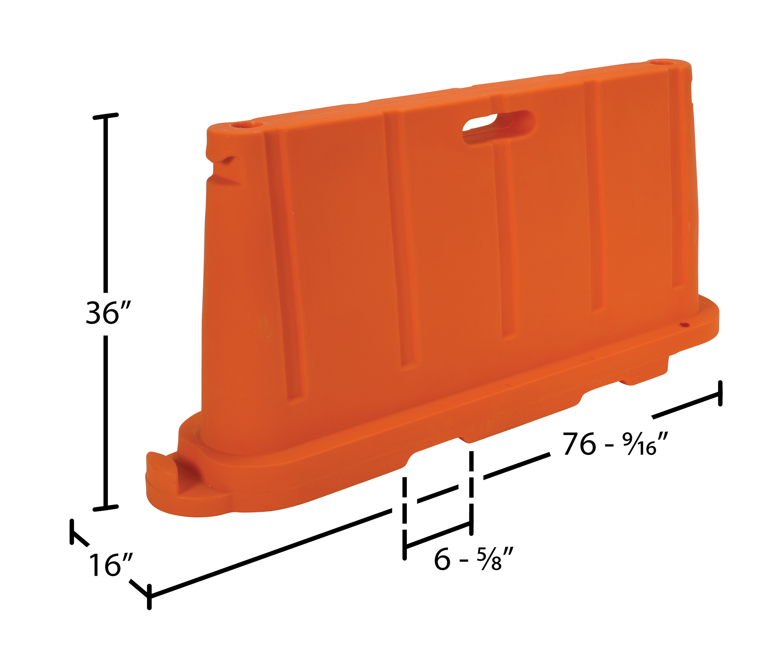 Polyethylene Stackable Barricade 76-1/2 In. x 16 In. x 36 In. OrangeThe portable barrier is ideal for traffic and crowd control. The unit can be filled with water or sand for added security. The barriers have additional forklift slots on the bottom of the unit for easy transportation and can be stacked during storage for extra space. Special colors and custom mold in graphic labeling is available upon request.