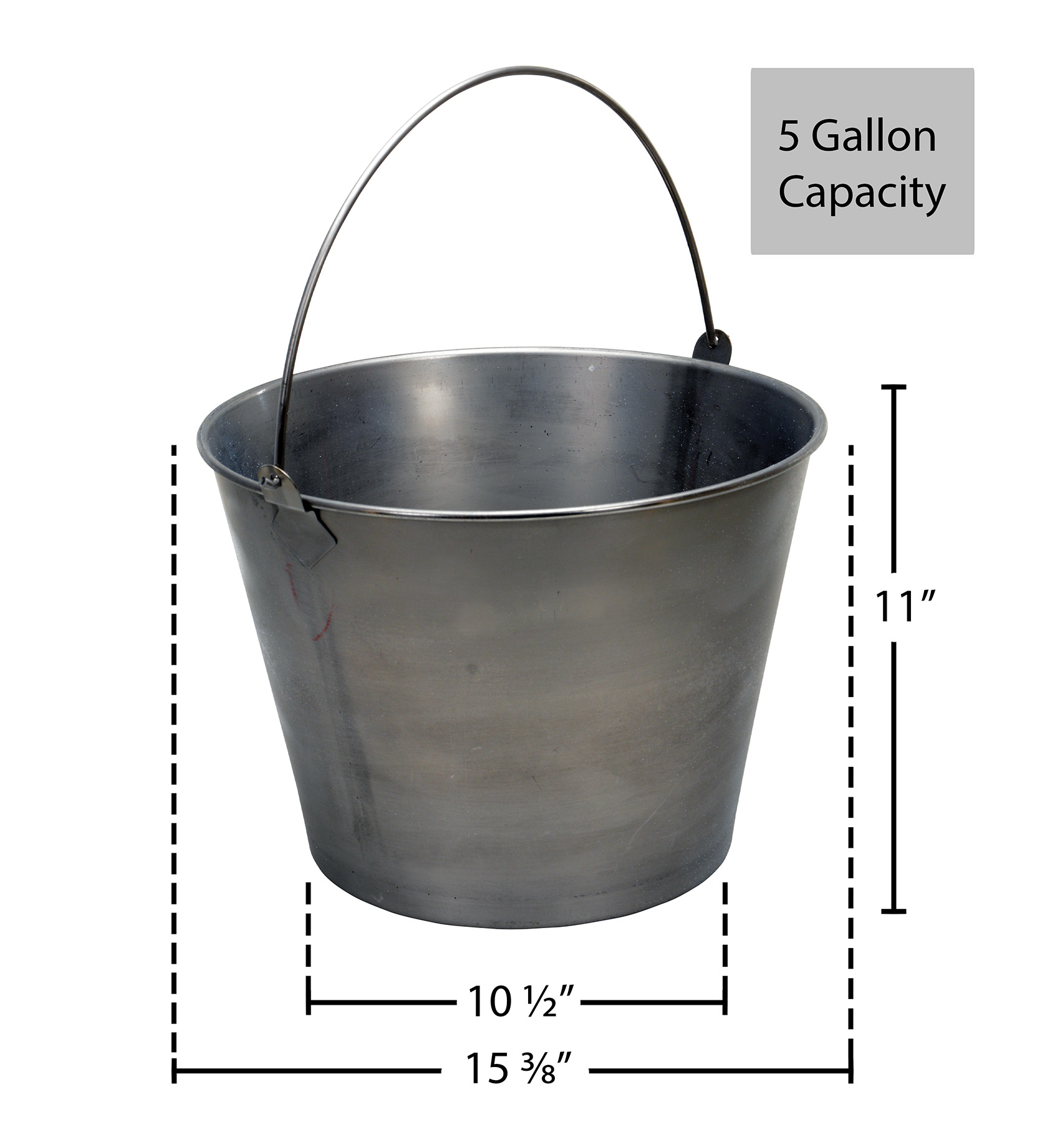 Stainless Steel Bucket 5 Gallon CapacityThe Stainless Steel bucket is for use in industrial and commercial applications where durability is required. Buckets are nestable and come standard with a carrying handle/bail for easy transport. Constructed of stainless steel.