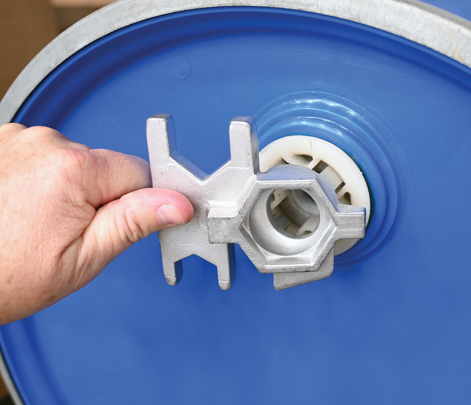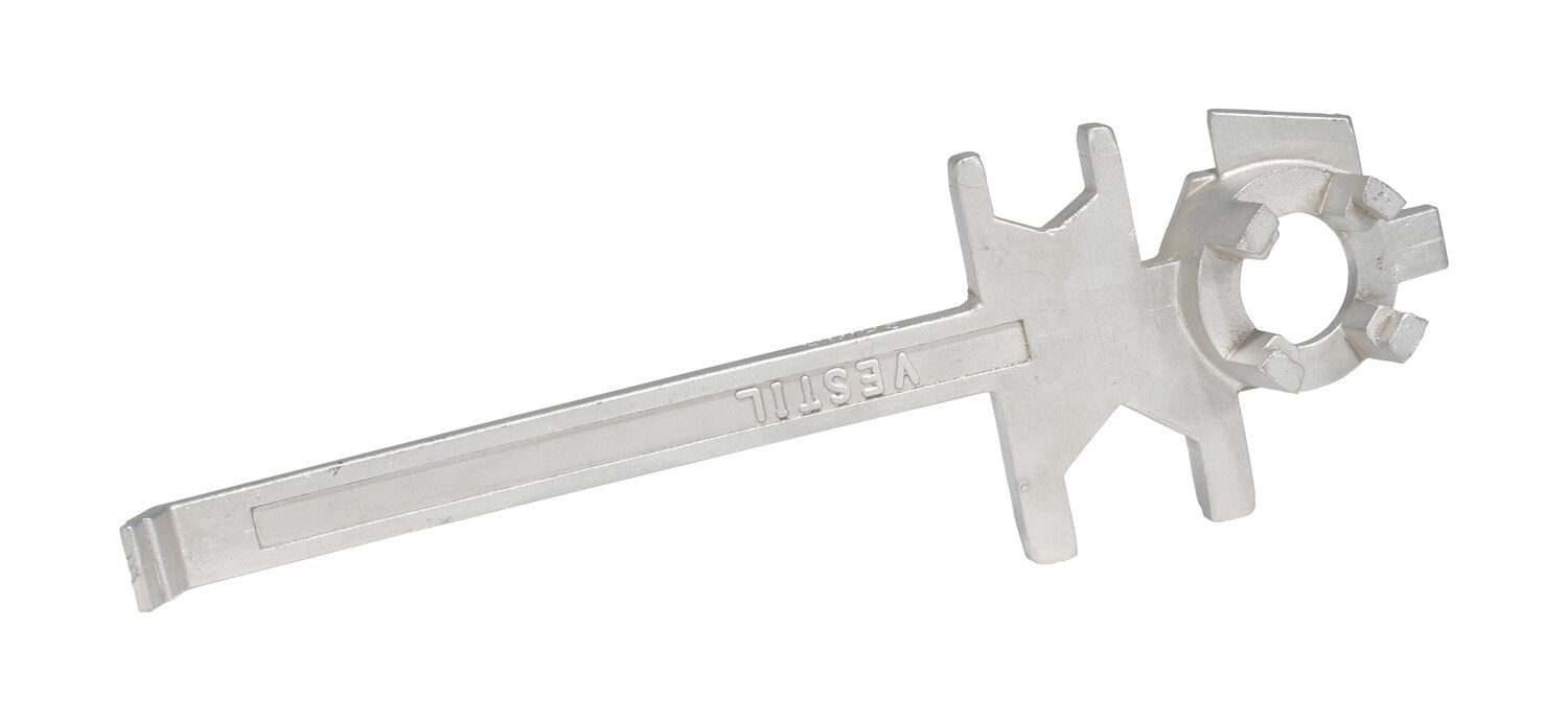 Stainless Steel Drum Bung Nut WrenchThis multipurpose, single ended, cast aluminum drum Bung nut wrench not only opens and closes drum bungs or plugs, they also work as a bung wrench, ring wrench and faucet wrench all in one! Wrench fits all types of industrial drum plugs and bungs in metal or plastic. These wrenches will not bend, break or chip. Patent pending.