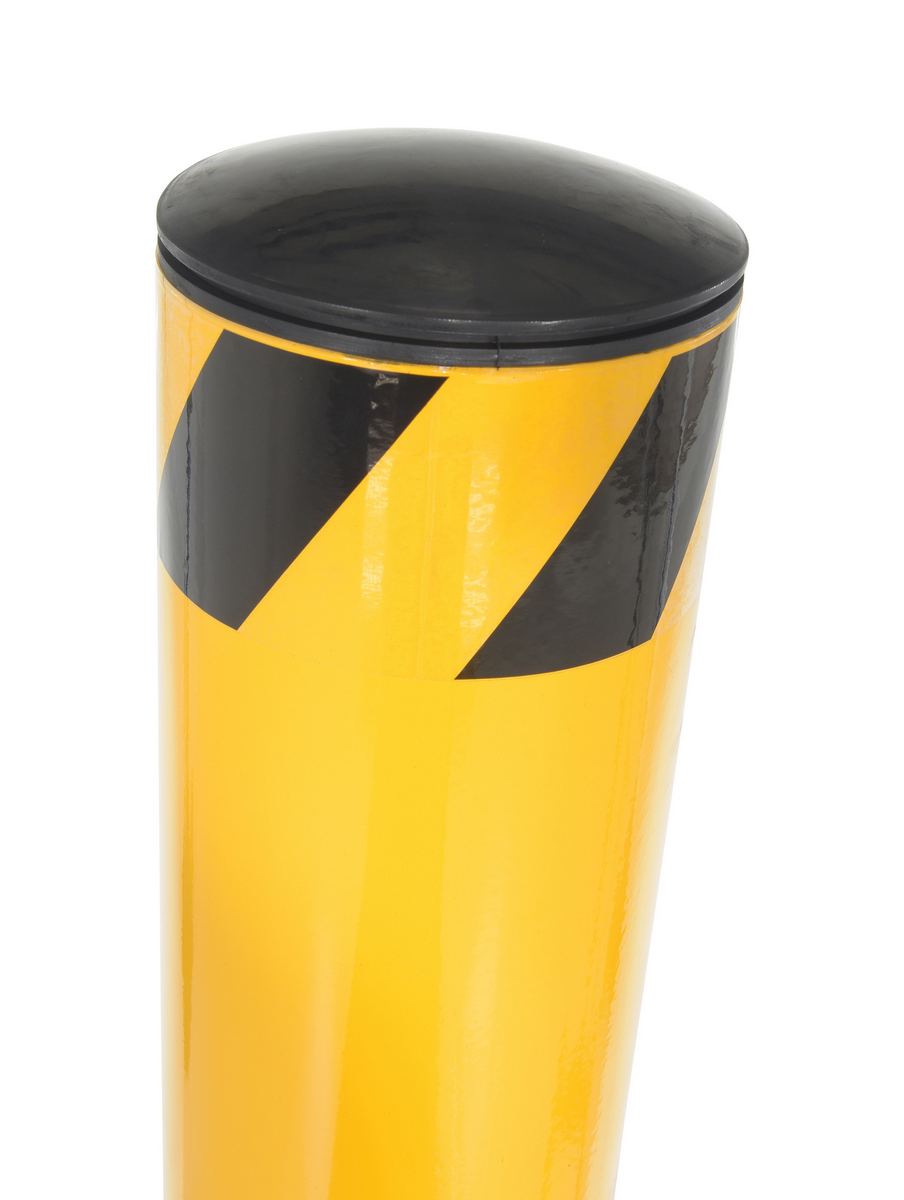 Safety bollards protect both objects and personnel. With a robust design the bollard can be used in a variety of settings, while enduring harsh conditions. Cap is removable and made of plastic. Powder coat finish for baked in added toughness.