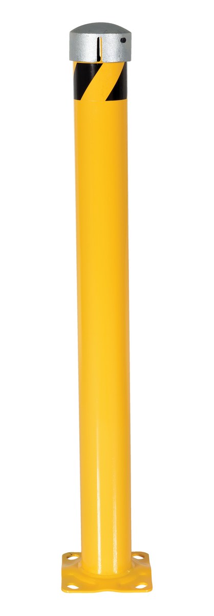 Steel Pipe Bollard with Removable Bolt-On Steel Cap and Slots 48 In. x 4-1/2 In. YellowCreate barriers around workstations, machinery, and outdoor space with steel pipe bollard with chain slots. Ideal for indoor and outdoor applications. Easy to assemble. Removable bolt-on steel top cap with socket set-screw. Place chain into chain slots, storing any excess chain inside the bollard, and place cap back onto bollard. The chain slots hold chain connected to other bollards. Base plate includes pre-drilled bollard. Heavy duty welded steel construction. Powder coat safety yellow finish.