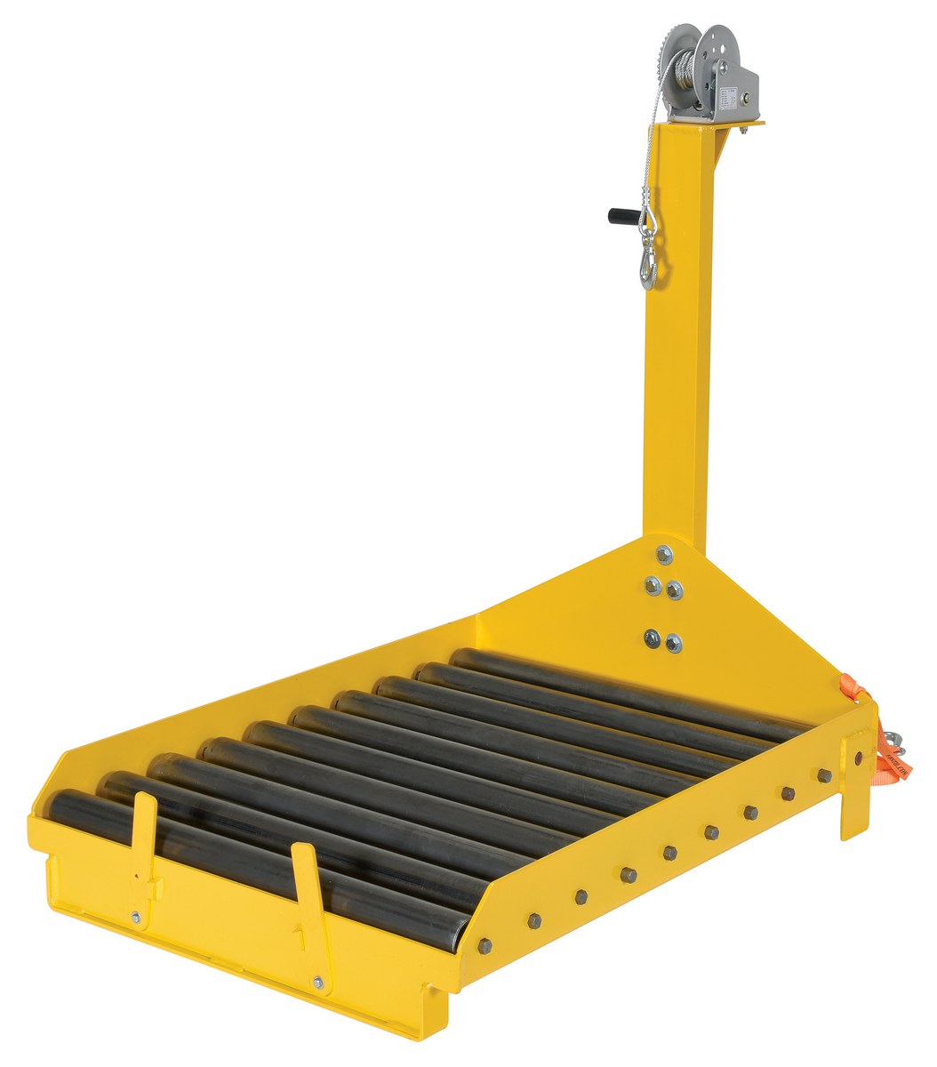 Fork Truck Battery Transfer Platform with Winch 4000 Lb. Capacity YellowThe battery transfer platform with winch features a roller deck for easy battery movement with the use of a pallet truck. The front locking safety tabs secure battery in platform. The unit has a welded steel construction with a powder coat yellow finish. Winch attachment can be installed easily to the battery transfer carts with the supplied hardware. The manual winch is designed to pull battery out of fork truck.