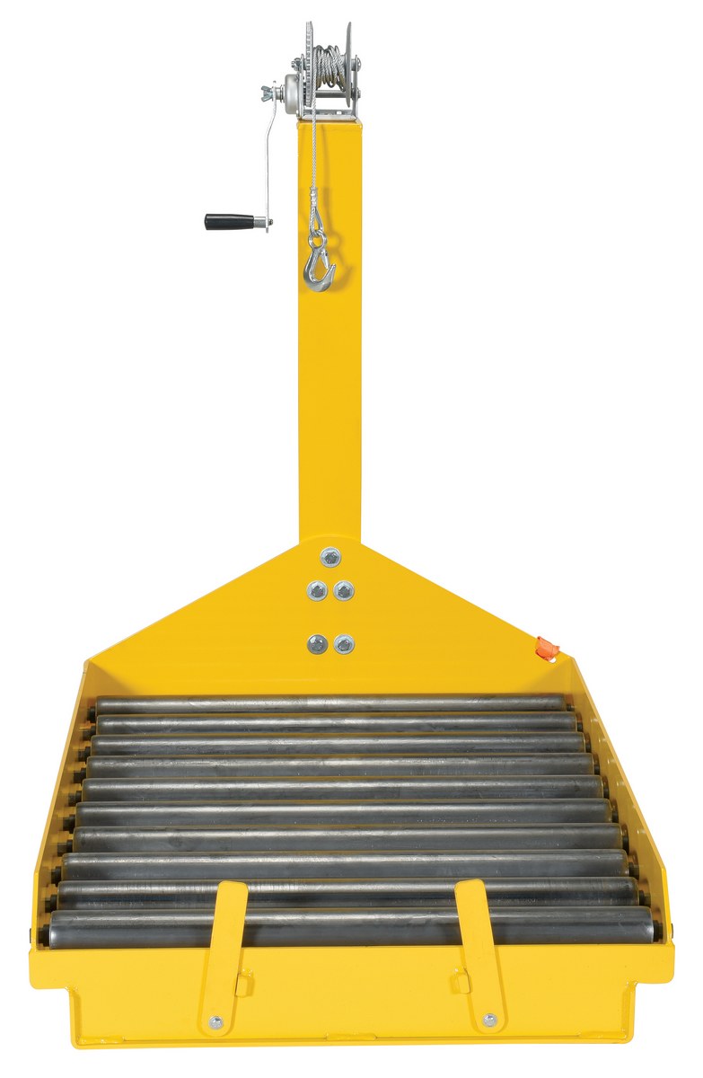 The battery transfer platform with winch features a roller deck for easy battery movement with the use of a pallet truck. The front locking safety tabs secure battery in platform. The unit has a welded steel construction with a powder coat yellow finish. Winch attachment can be installed easily to the battery transfer carts with the supplied hardware. The manual winch is designed to pull battery out of fork truck.