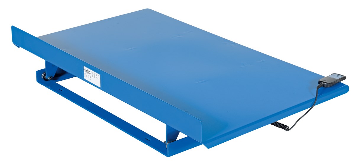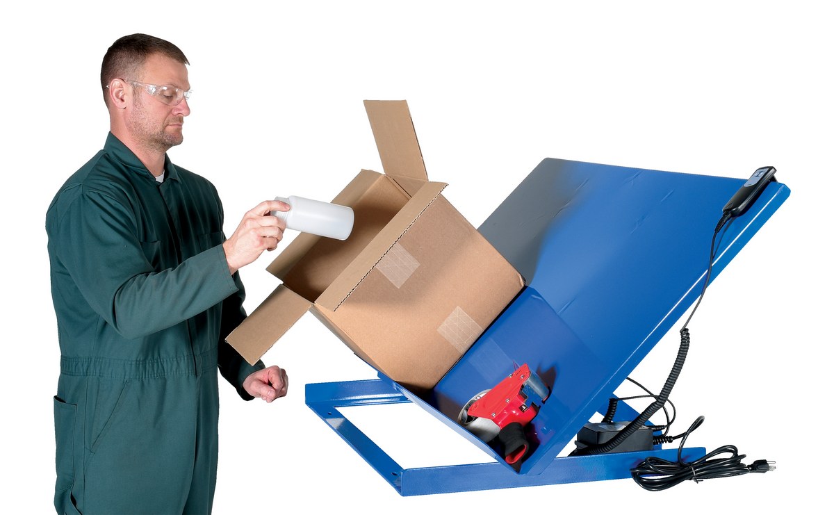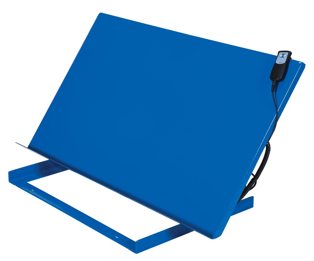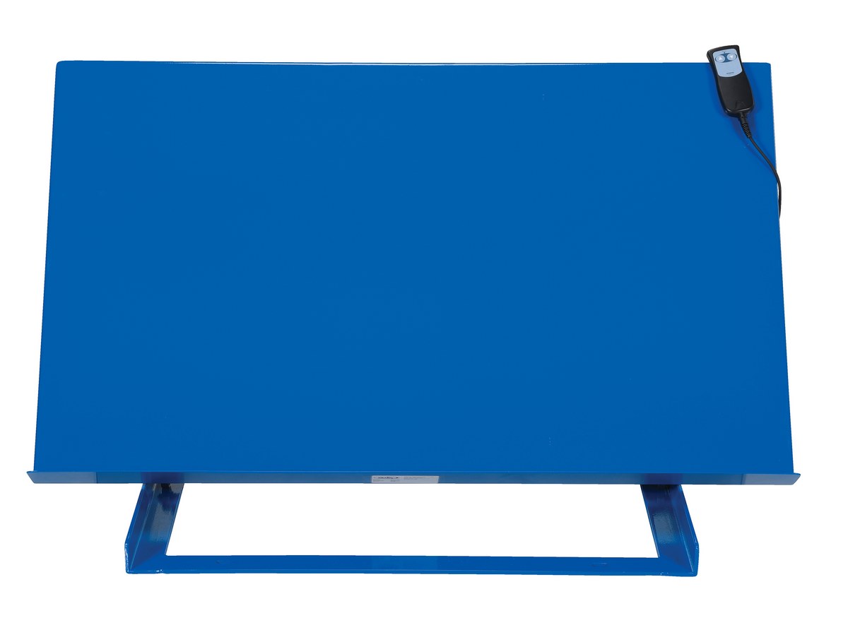 Linear Bench Top Tilter 28 In. x 46 In. 500 Lb. Capacity BlueThe heavy-duty bench top tilter easily attaches to most industrial table tops, work benches, and mobile lift tables of sufficient load capacity and surface size. The unit slides back as it tilts to maintain the center of gravity over the frame. Manual units can be adjusted only when unloaded and the linear actuated units are equipped with a push-button hand pendant control. The flat base plate has slotted holes for installation.