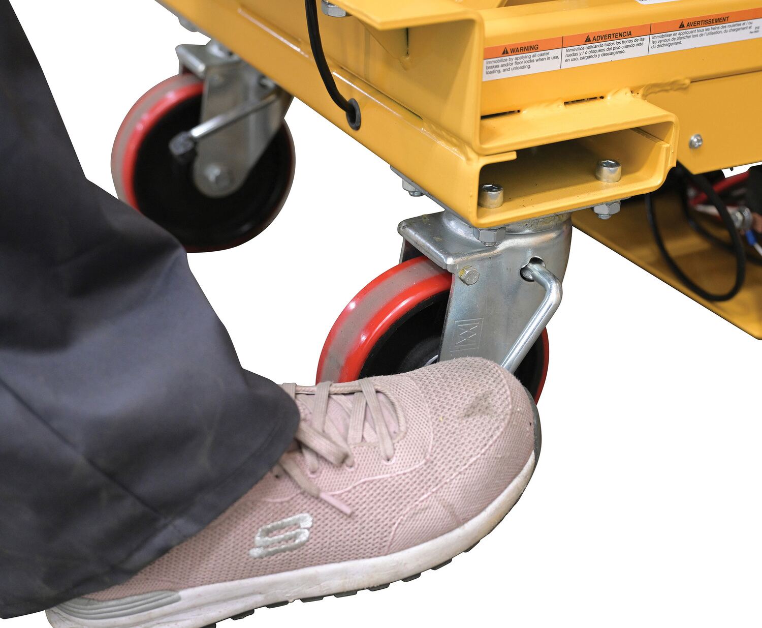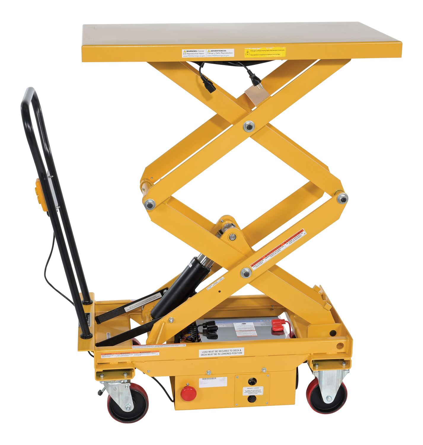 Steel DC Powered Hydraulic Double Scissor Cart 20-1/2 In. x 39-3/4 In. 1000 Lb. Capacity YellowThe DC powered Hydraulic elevating cart is ideal for quick lifting and ergonomic material handling. The battery-powered unit allows operators to raise and lower platform with the push of a button. The unit rolls on two rigid and two swivel polyurethane casters. It includes battery, on-board battery charger and battery charge indicator gauge. Features an internal safety velocity fuse in each cylinder.