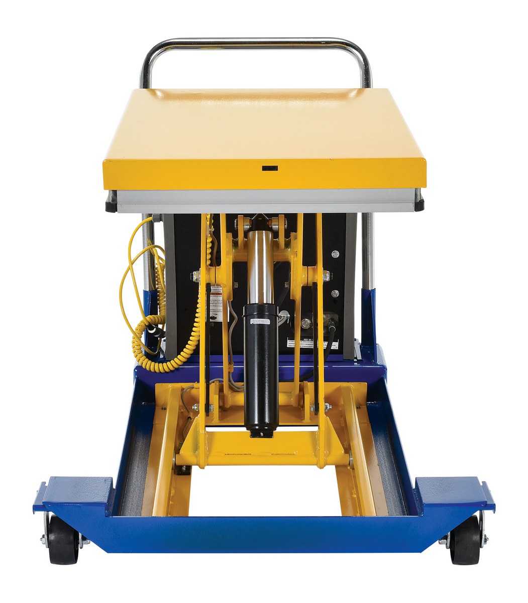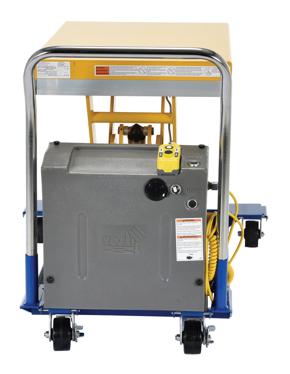 Steel DC Powered Scissor Cart 36 In. x 24 In. 1500 Lb. Capacity Blue / YellowThe DC powered Scissor Cart table provides an unparalleled support in lifting, palletizing, loading, and unloading applications. The cart is raised or lowered with a DC powered motor. The unit rolls smoothly on two rigid and two swivel phenolic casters with brakes. The internal DC powered electric motor and battery is included on DC units. The built-in battery charger is AC powered and is included. Push buttons to raise and lower lift are located on a hand control with a coil cord, which is standard. The platform is equipped with perimeter pinch-point guard for OSHA compliance. The push handle is removable. Features an internal safety velocity fuse in each cylinder.