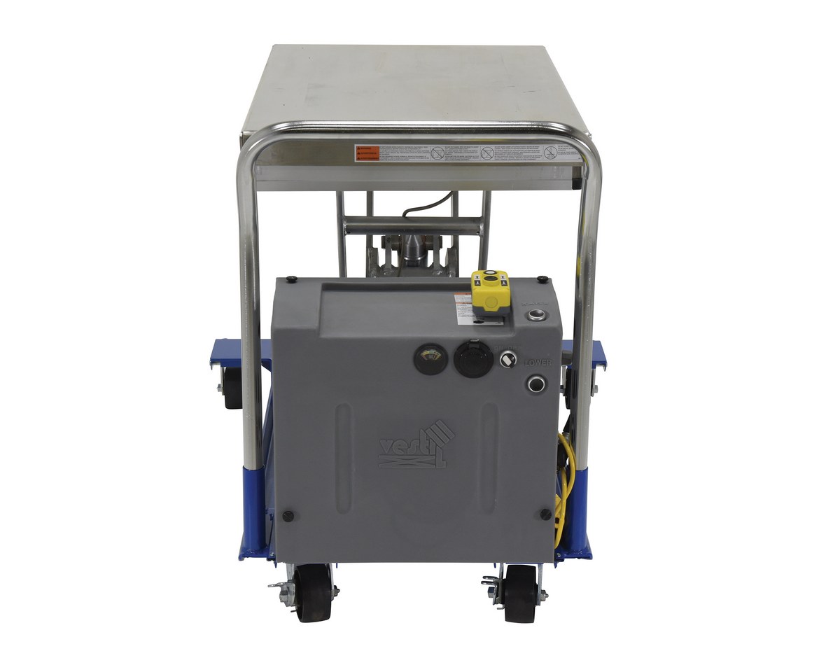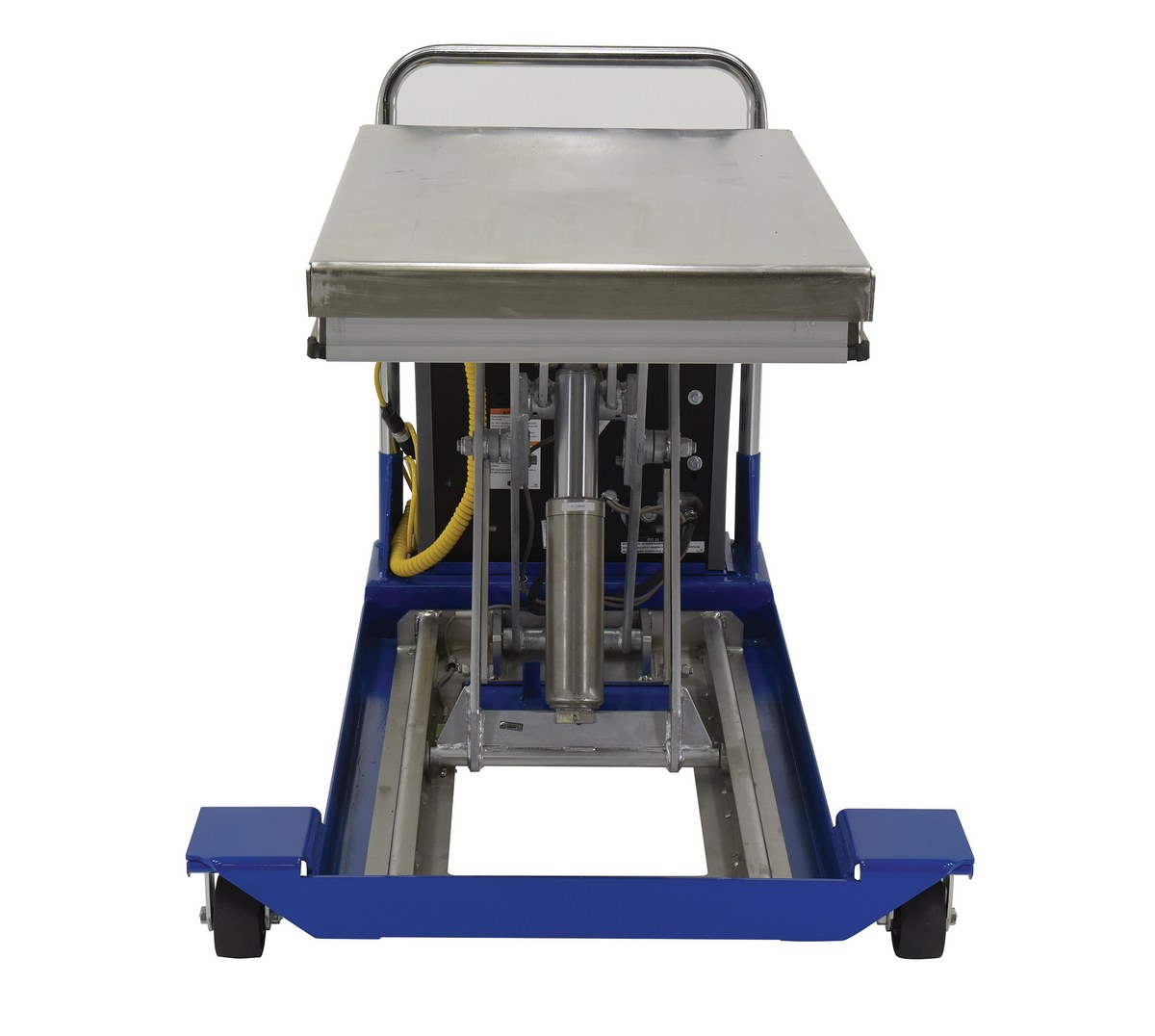 Partially Stainless Steel DC Powered Scissor Cart 36 In. x 24 In. 1500 Lb. Capacity Blue / YellowTables provide unparalleled ergonomic support in lifting, palletizing, loading, and unloading applications. Carts are raised or lowered with a 12V DC powered motor. Internal DC powered electric motor and 12V battery is included on DC units. Electric motor is rated at 1600 watts. Includes battery charger (operated on 115V AC power). Push buttons to raise and lower lift are located on power unit. Detachable hand control on coil cord is standard. Key-operated on/off control for better security is built into the power unit.