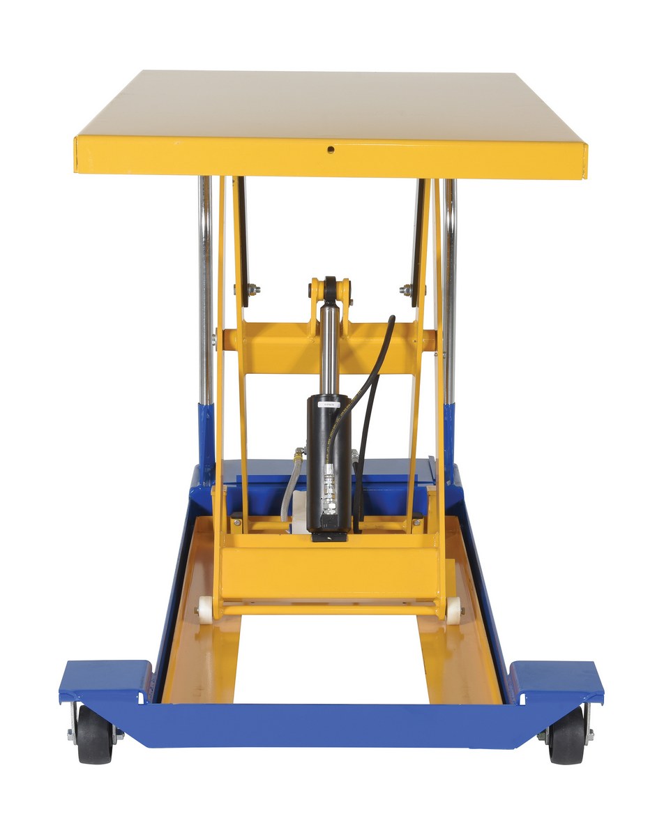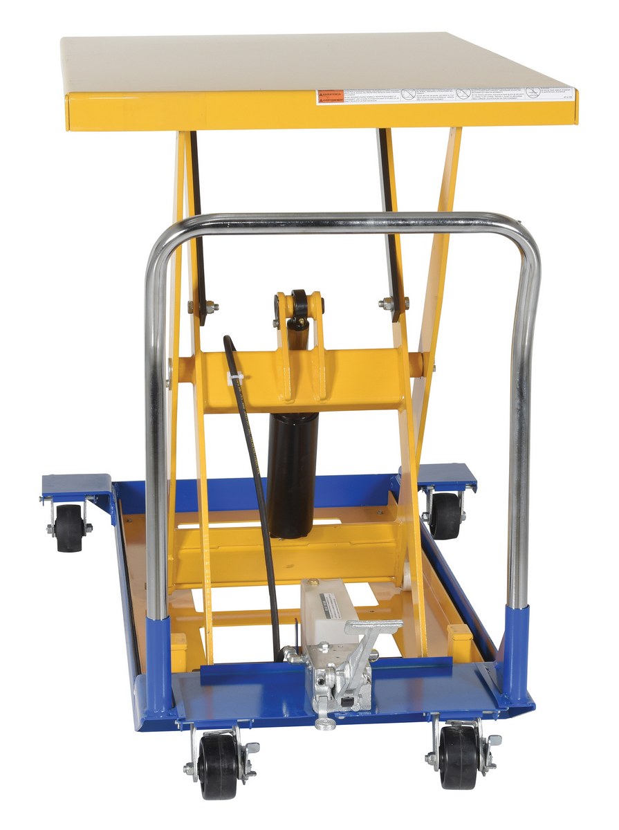 Steel Foot Pump Powered Scissor Cart 48 In. x 32 In. 1000 Lb. Capacity Blue / YellowThe manually powered Scissor Cart table provides an unparalleled support in lifting, palletizing, loading, and unloading applications. The cart is raised or lowered with a manual two-speed foot pump. The unit rolls smoothly on two rigid and two swivel phenolic casters with brakes. The push handle is removable. Features an internal safety velocity fuse in each cylinder.
