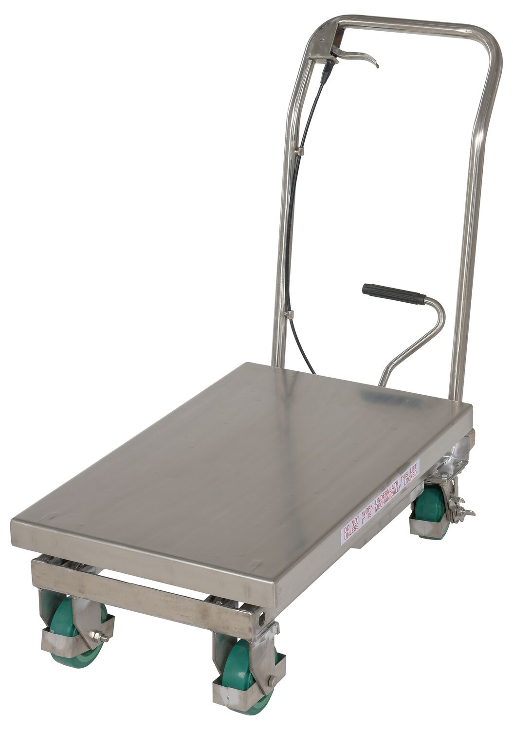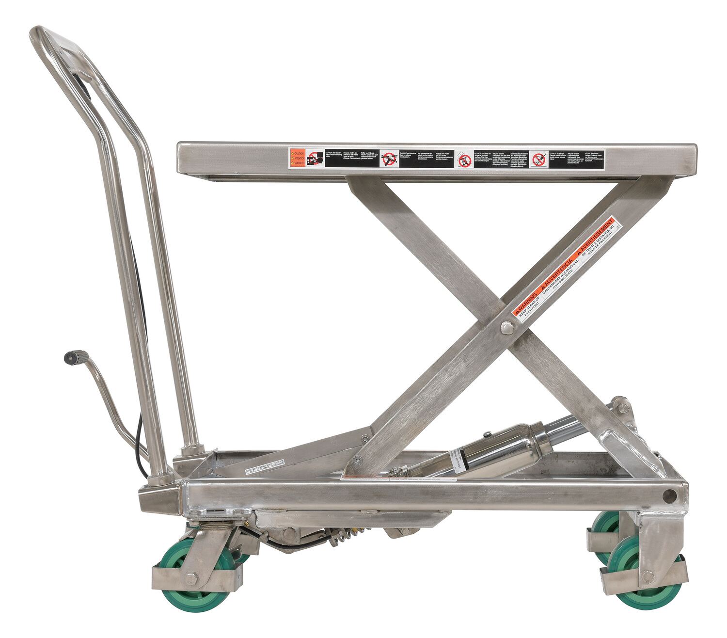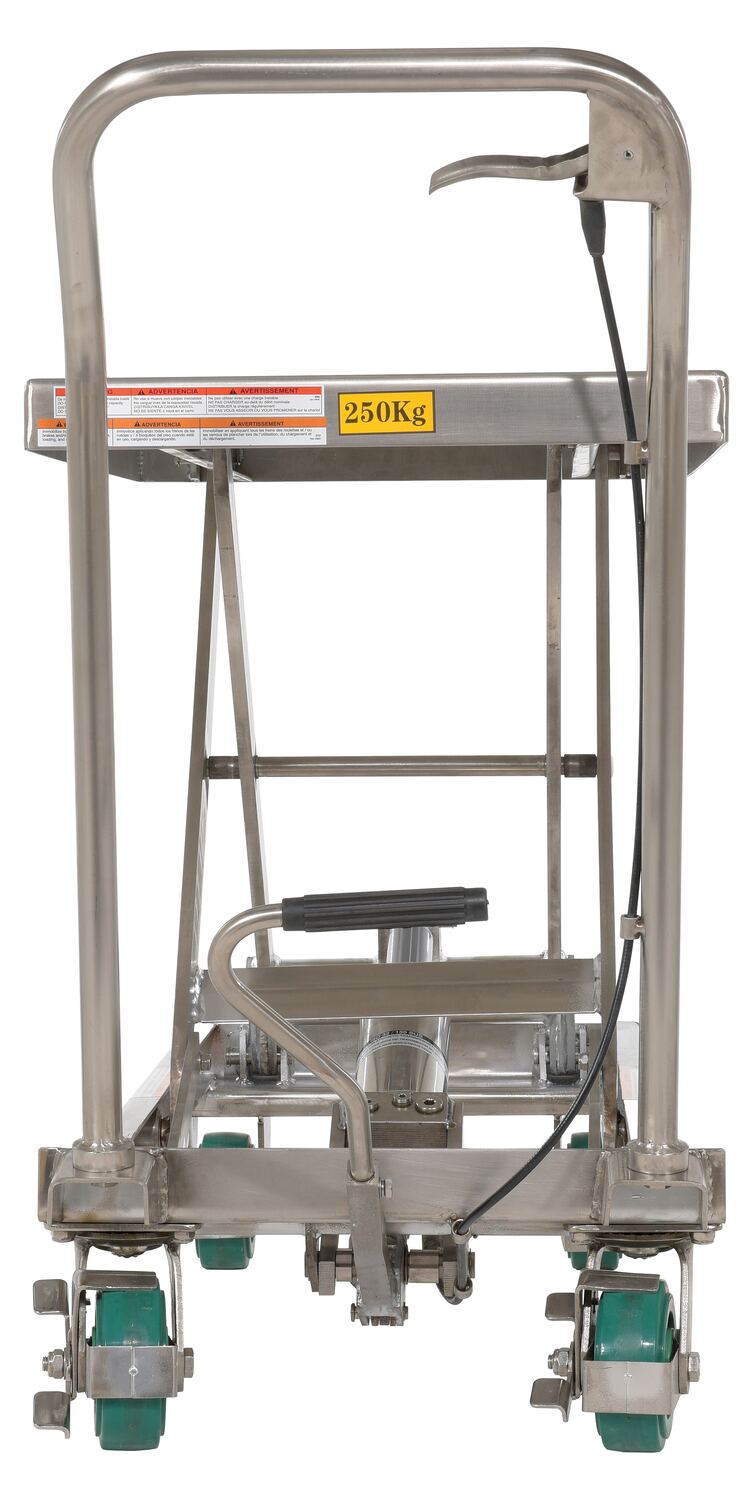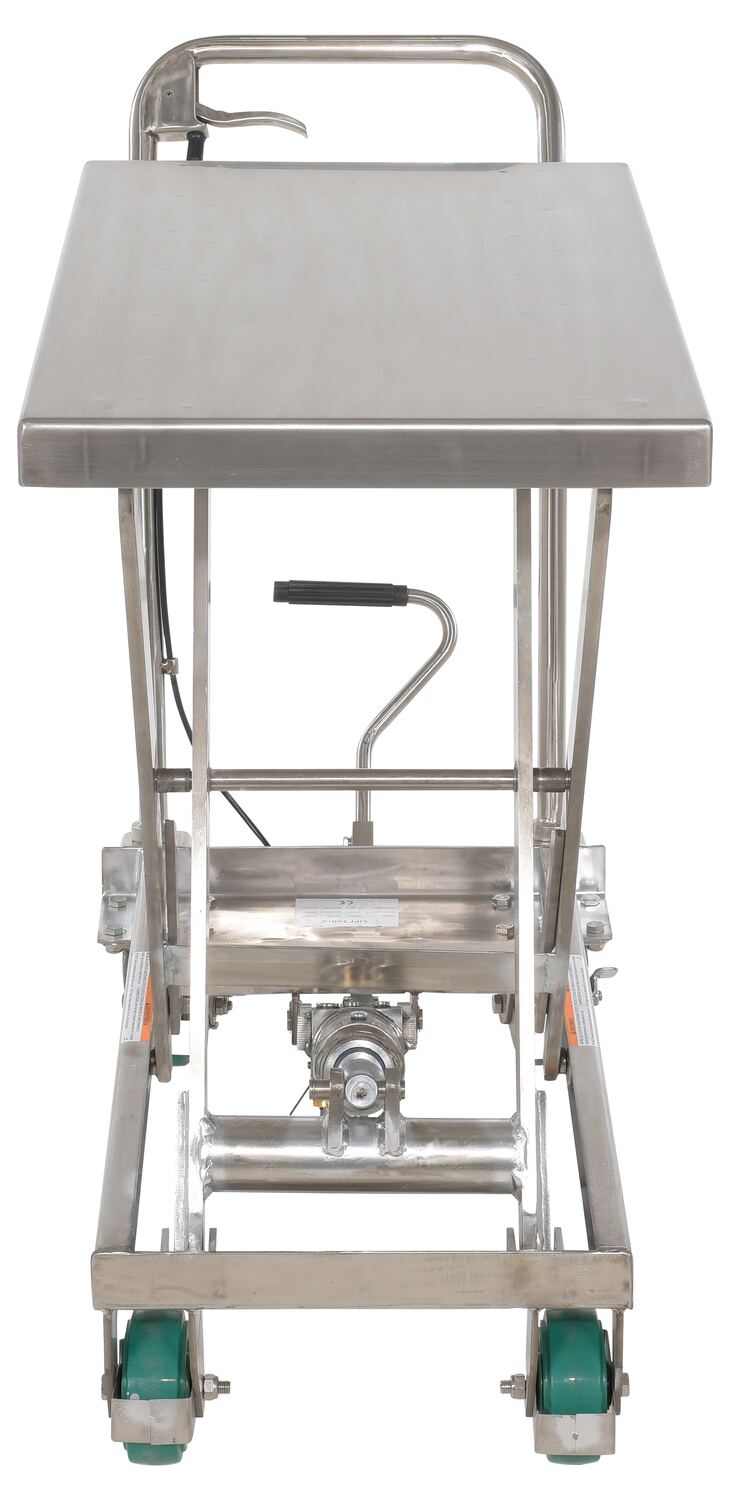 Stainless Steel Scissor Cart 32-1/2 In. x 19-3/8 500 Lb. Capacity SilverThe premium scissor lift cart is constructed of heavy duty steel and designed to withstand the most demanding industrial environments. The simplicity and compactness of these products make them ideal for lifting and transporting loads, order-picking, die handling, and for use in support of assembly operations. There is little exertion required to maneuver the deck due to the high quality foot-actuated, single speed hydraulic pump for raising . A unique tilt-up table top allows for safe and easy maintenance.