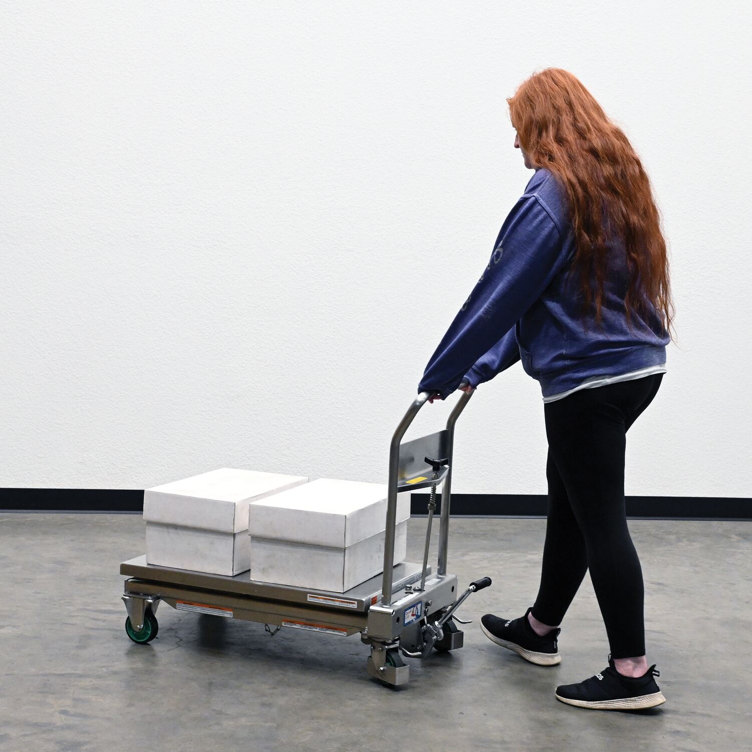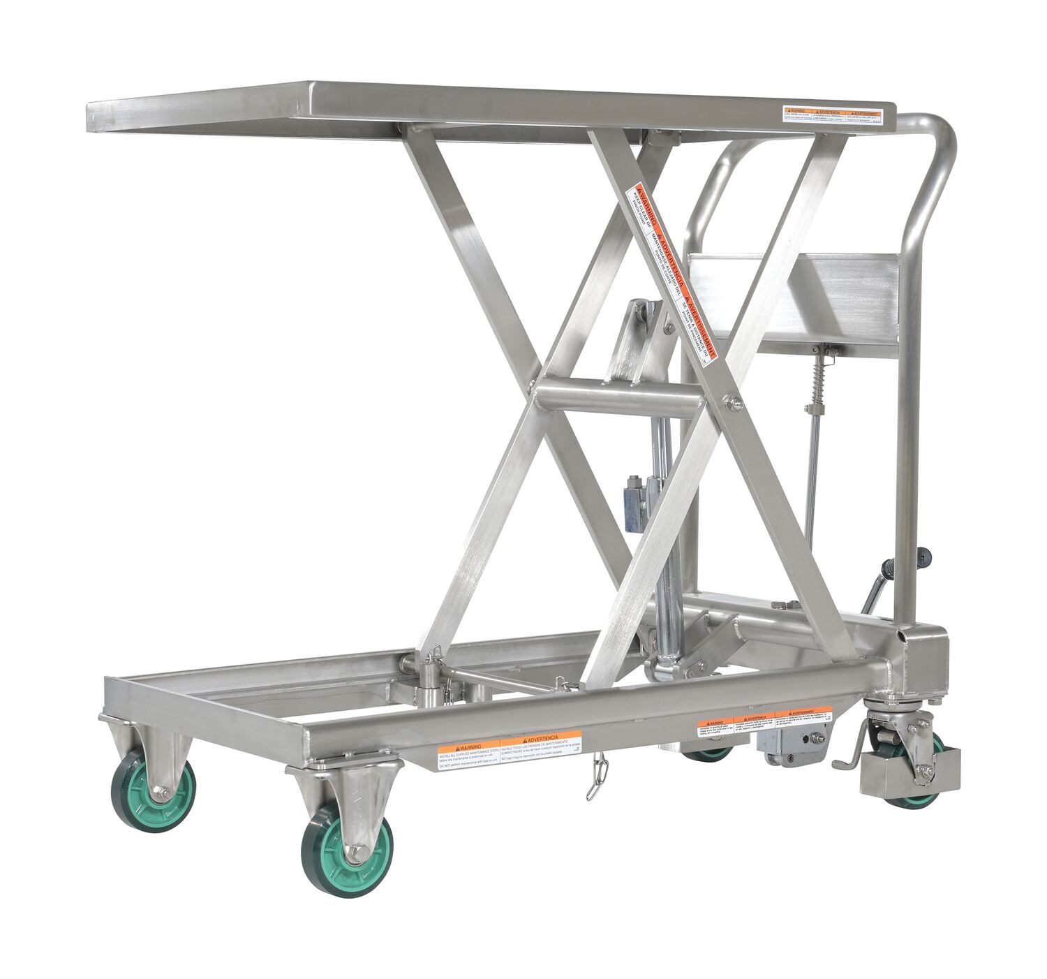 Stainless Steel Hydraulic Cart 19-1/2 In. x 31-1/2 In. 550 Lb. Capacity SilverThe Hydraulic elevating cart minimizes worker bending and lifting through its ergonomic design and portability. Material can be easily loaded onto a cart from a table, lowered to a safe transporting height, and raised to unload at destination. The foot pump includes a soft-lowering down valve. The unit moves easily on four polyurethane casters; two swivel with brakes and two rigid. Features a two-speed foot pump. Foot pump pedal, pump assembly and hydraulic cylinder are chrome plated. Rest of the unit is fully stainless construction. Features an internal safety velocity fuse in each cylinder.