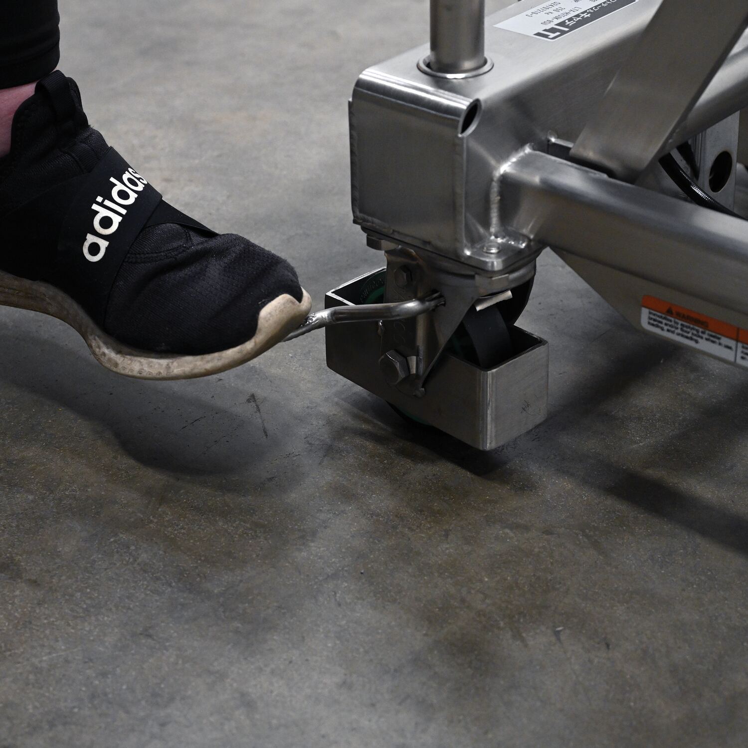 The Hydraulic elevating cart minimizes worker bending and lifting through its ergonomic design and portability. Material can be easily loaded onto a cart from a table, lowered to a safe transporting height, and raised to unload at destination. The foot pump includes a soft-lowering down valve. The unit moves easily on four polyurethane casters; two swivel with brakes and two rigid. Features a two-speed foot pump. Foot pump pedal, pump assembly and hydraulic cylinder are chrome plated. Rest of the unit is fully stainless construction. Features an internal safety velocity fuse in each cylinder.