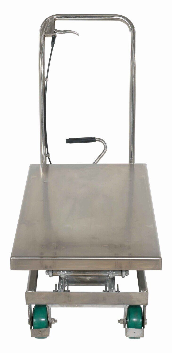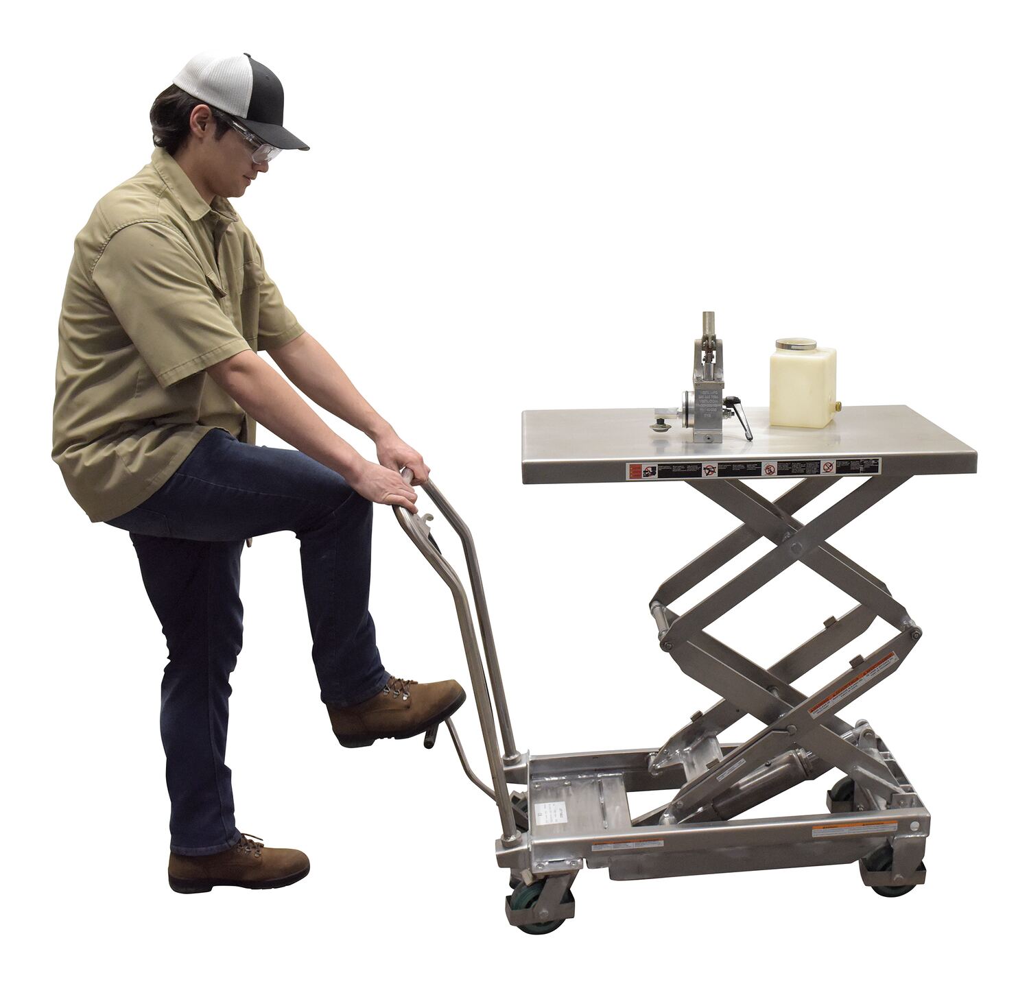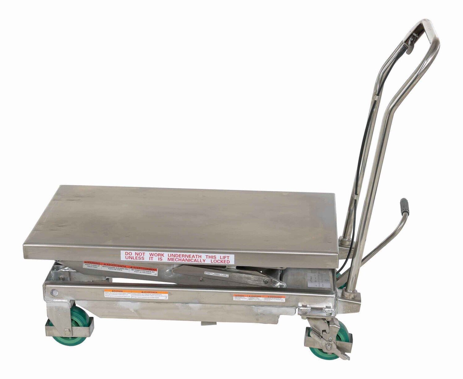 304 Stainless Steel Double Scissor Cart 36-1/4 In. x 19-3/8 In. 600 Lb. Capacity SilverThe premium scissor lift cart is constructed of heavy duty steel and designed to withstand the most demanding industrial environments. The simplicity and compactness of these products make them ideal for lifting and transporting loads, order-picking, die handling, and for use in support of assembly operations. There is little exertion required to maneuver the deck due to the high quality foot-actuated, single speed hydraulic pump for raising . A unique tilt-up table top allows for safe and easy maintenance.
