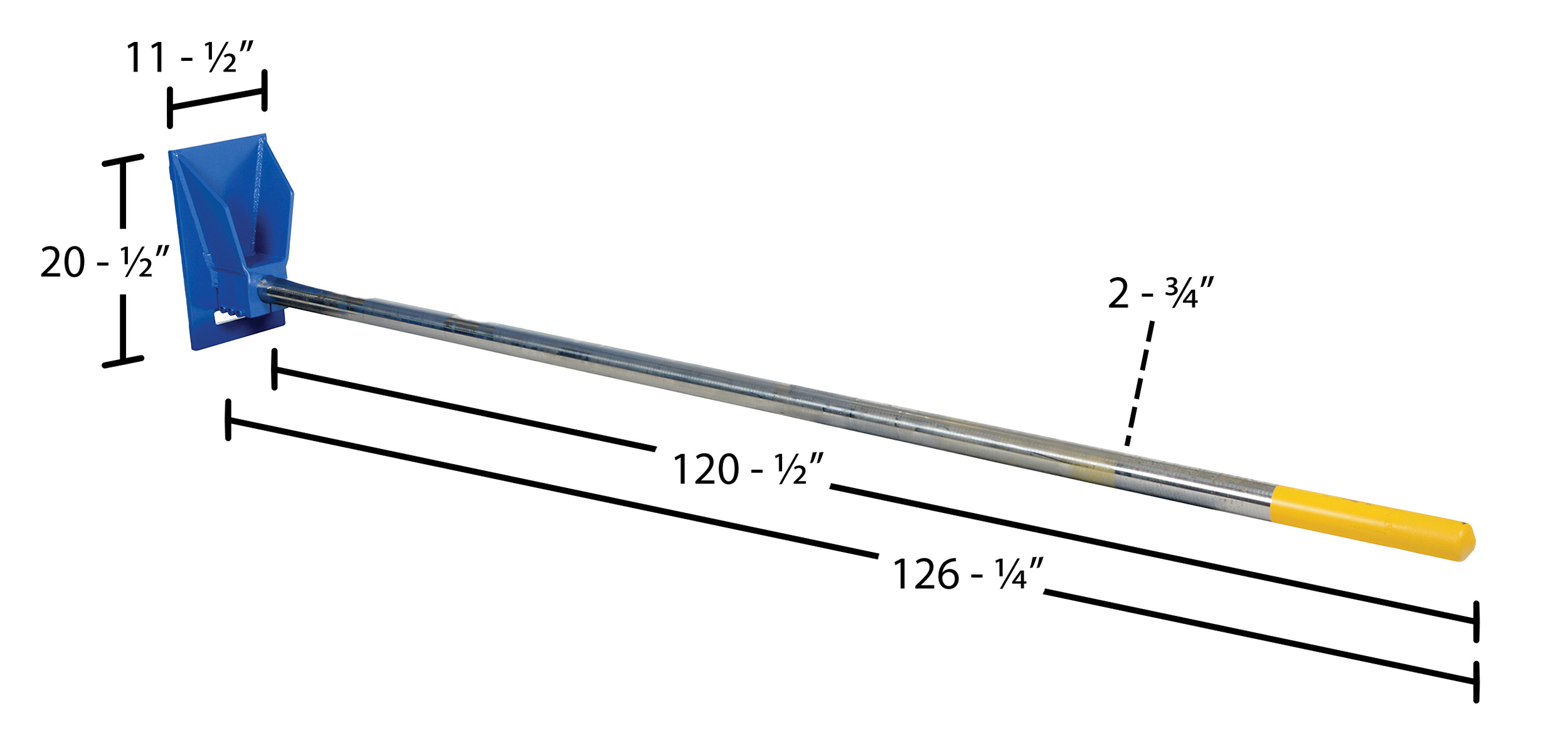 Steel Carriage Mount Class II Rug Ram Boom 120 In. 2200 Lb. Capacity Blue/SilverTransport rolls of carpet with this sturdy rug ram/carpet pole. High strength, rotate capable, replaceable pole has tapered tip. This Carriage Mounted rug ram class II features a spring loaded locking pin to secure them to the carriage.