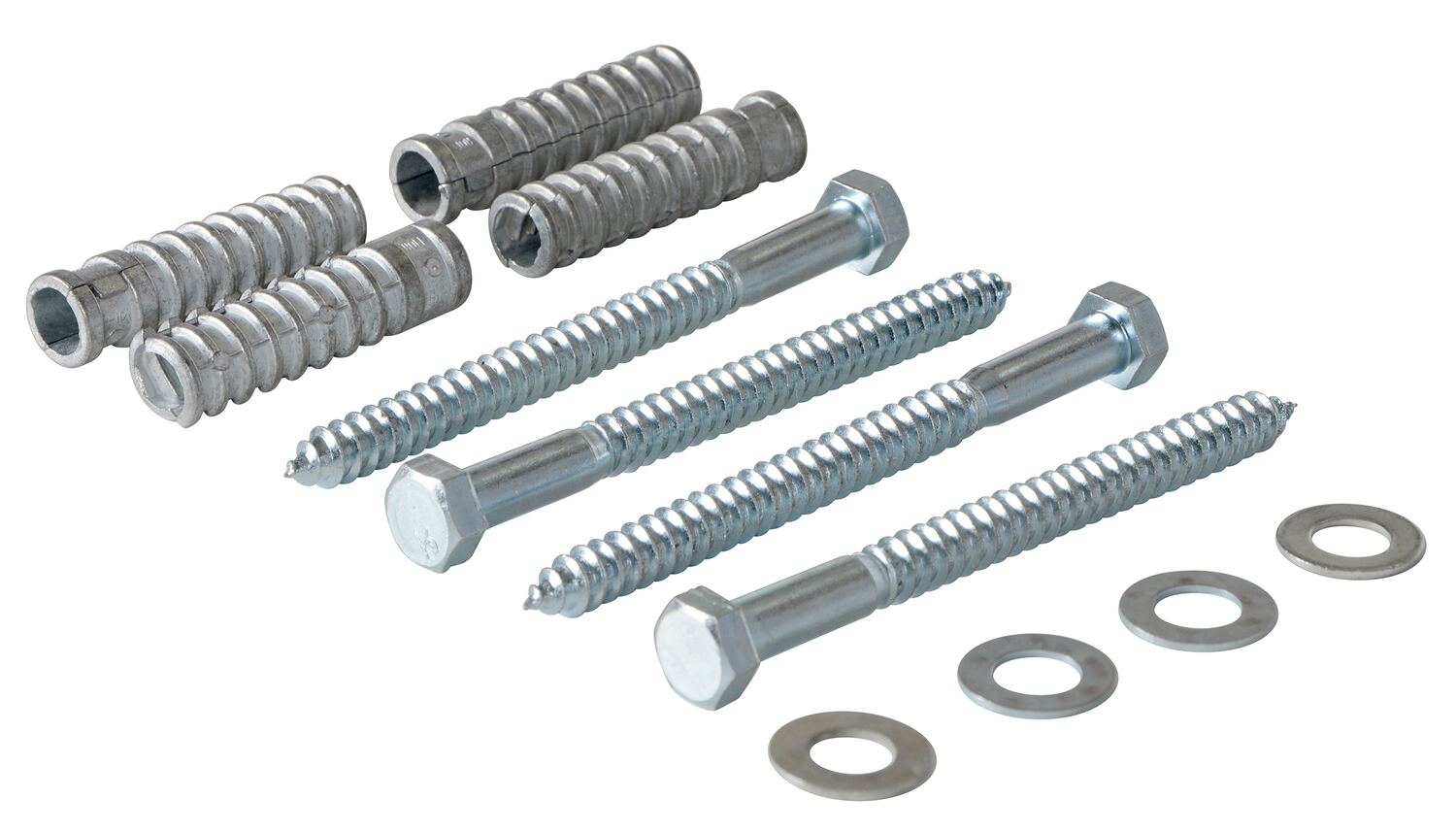 The hardware package provides a simple solution to mounting car stops to a concrete surface. The package includes bolts, anchors, and washers for safe, secure attachment.