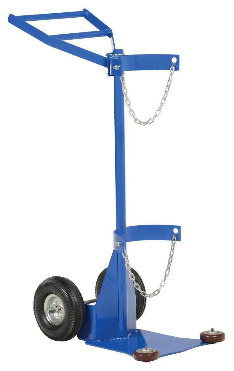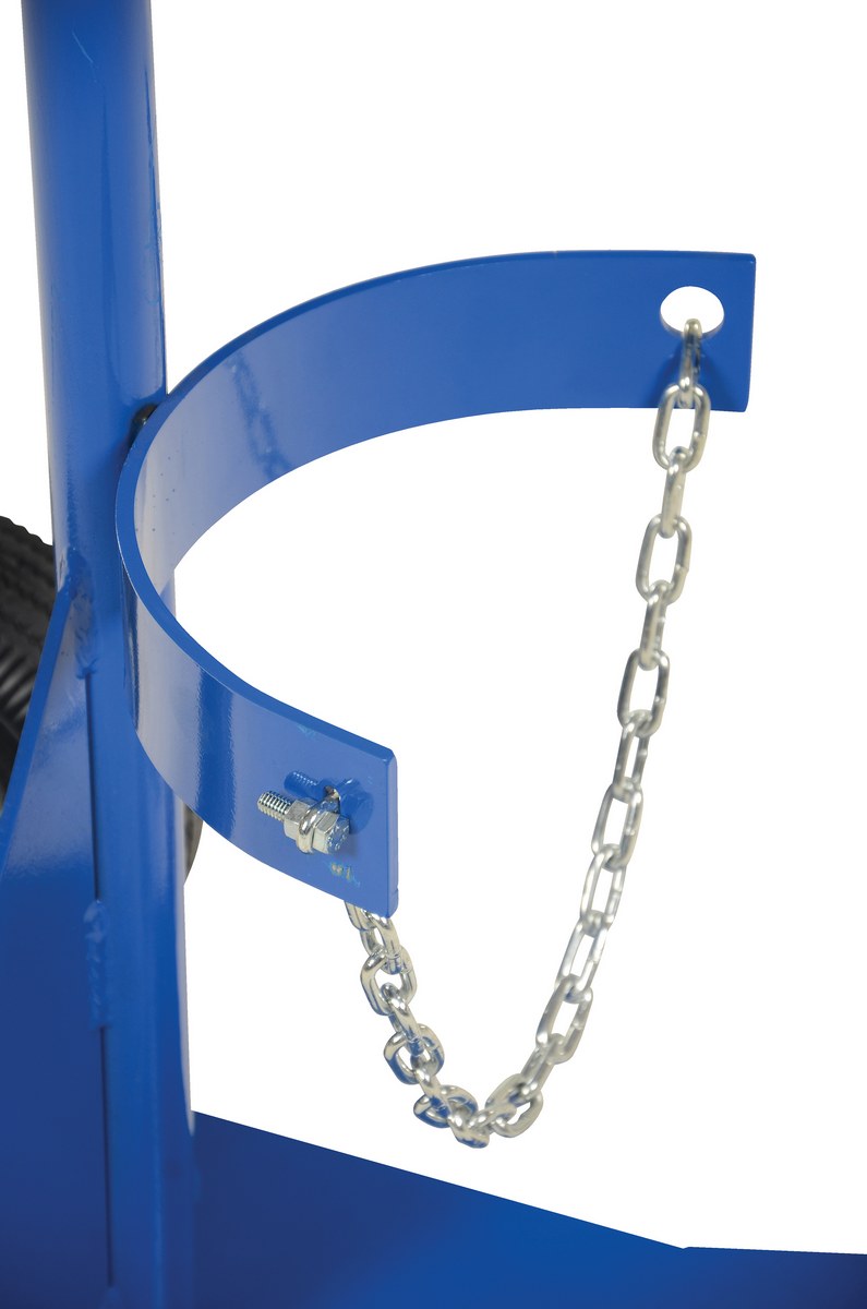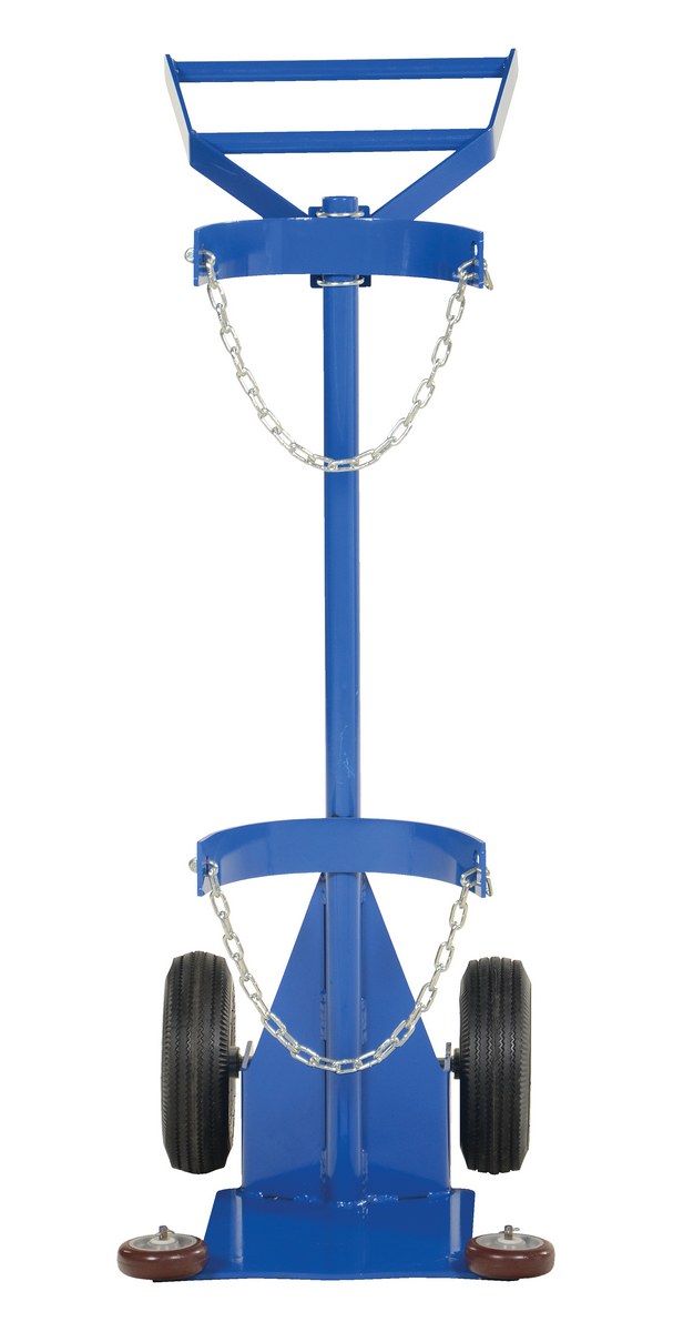 Steel Portable Deluxe Cylinder Lifter with Pneumatic Wheels 27-1/16 In. x 19 In. x 51-3/8 In. 500 Lb. BlueThe Cylinder dolly transports cylinders from workstation to workstation. This deluxe version feature roller guides attached to the nose plate. The hard rubber roller guides allow for easier entry onto the nose plate. Secure the cylinder with the included restraint chains. Tilt unit back and transport.